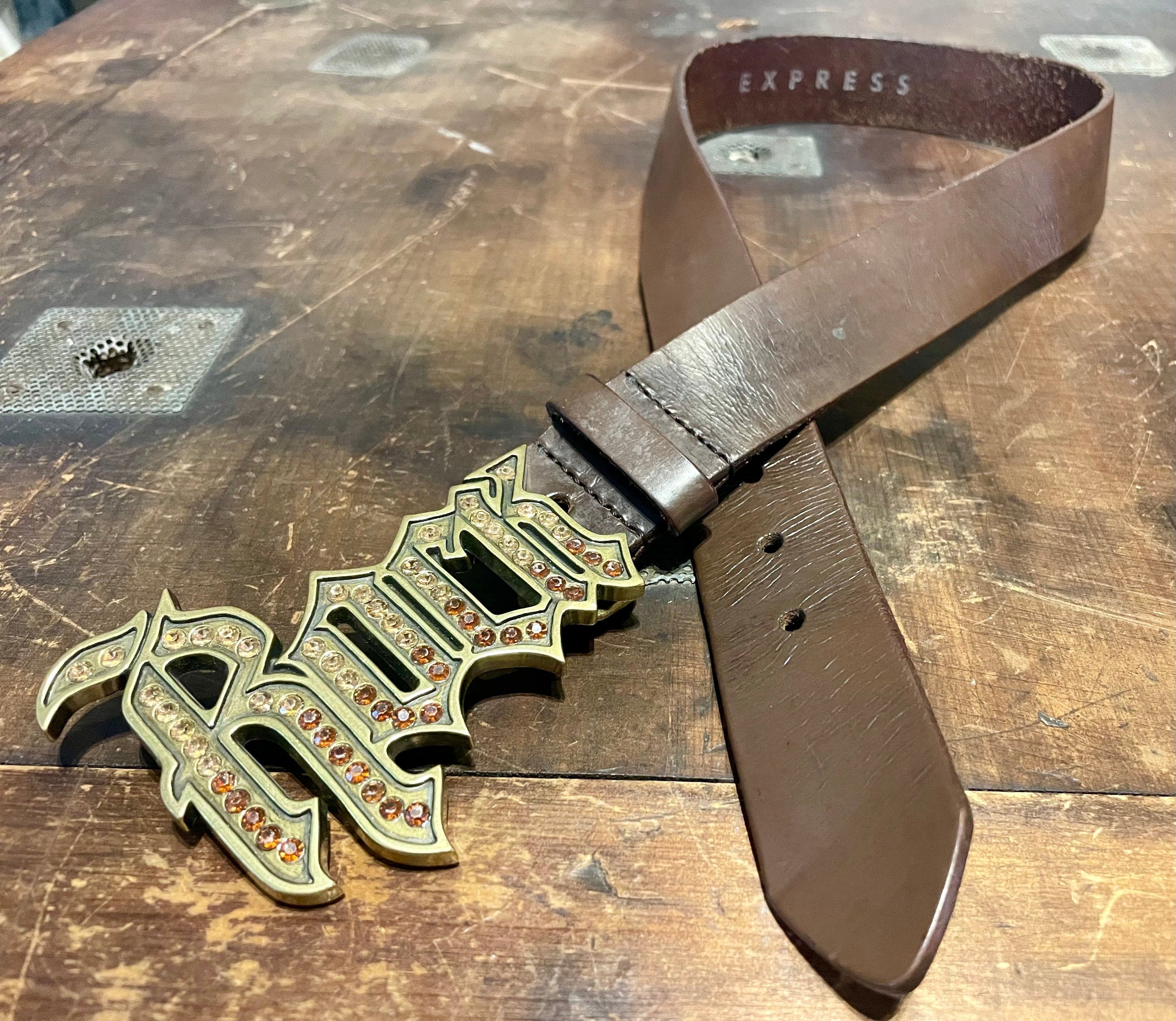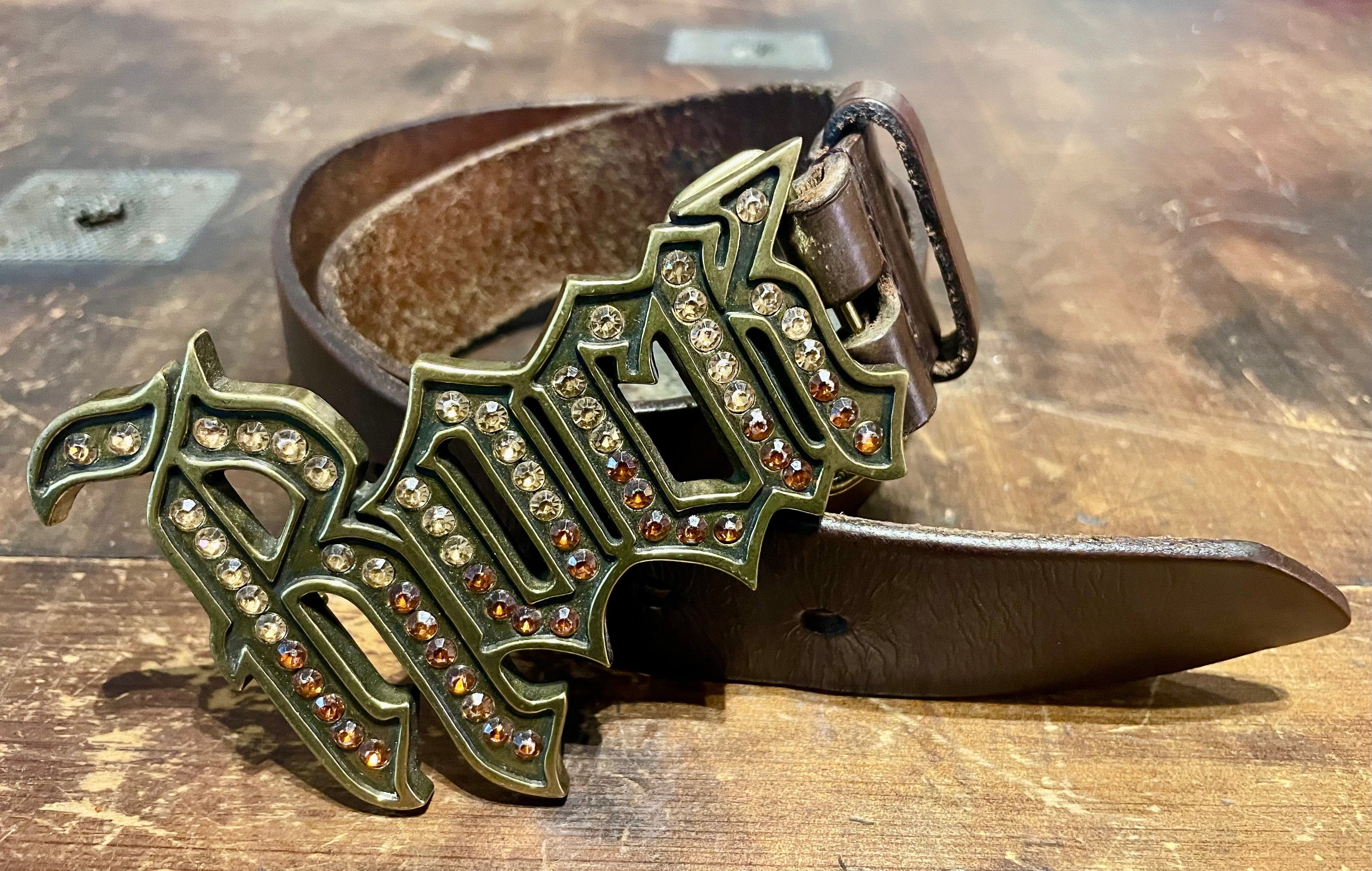 Imported vintage belt in perfectly worn in brown Italian leather with embellished “Rock” peg-in-hole brass metal buckle.