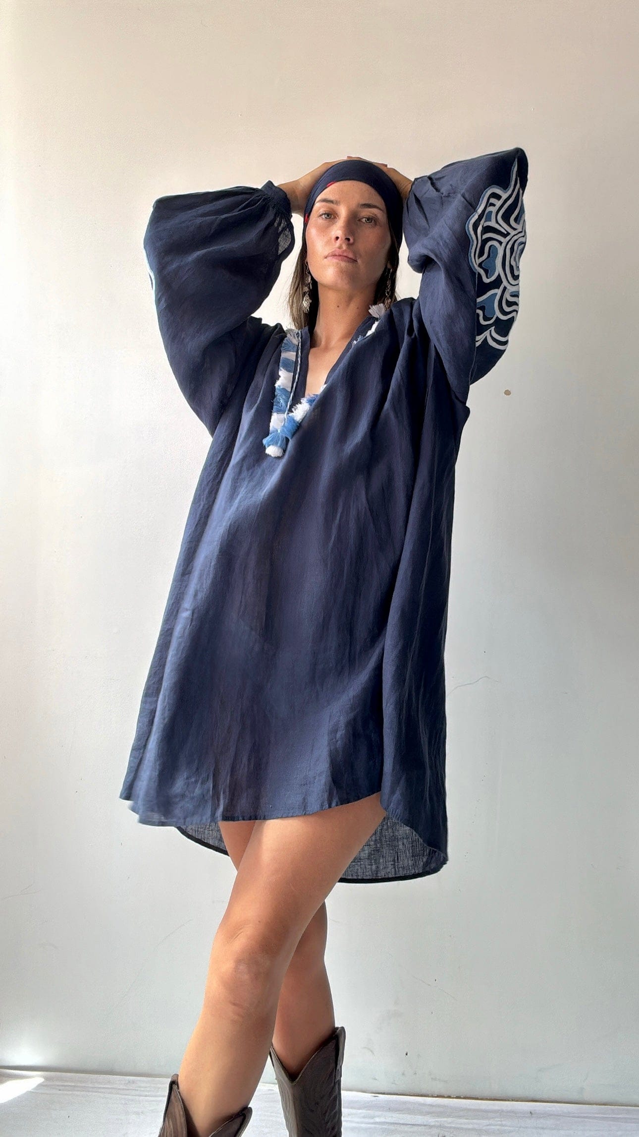 Navy blue 100% high grade linen dress tunic dress in Vyshyanka style with blue and white embroidered detail. Wear as a dress or layer up as a tunic style with slouchy jeans. Insert side pockets and secluded domes all the way through. Versatile staple 🙏🏻 model 1.74cm and NZ size 8/10 wearing the XL