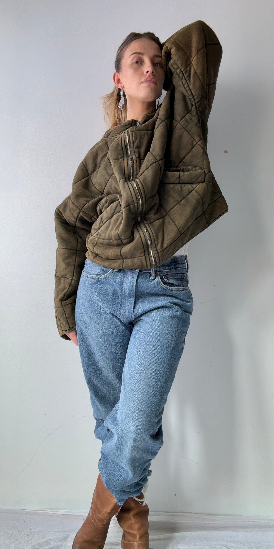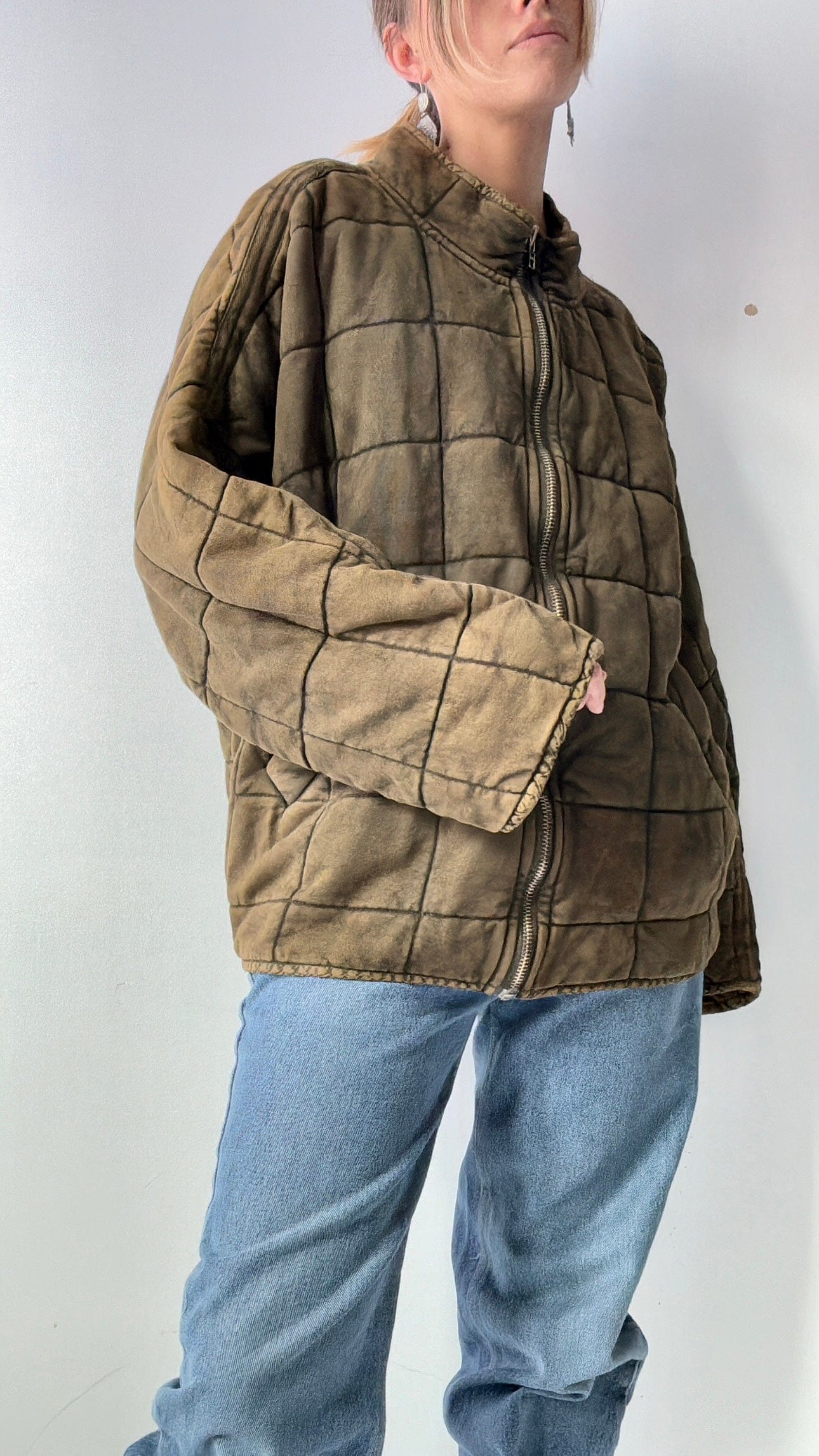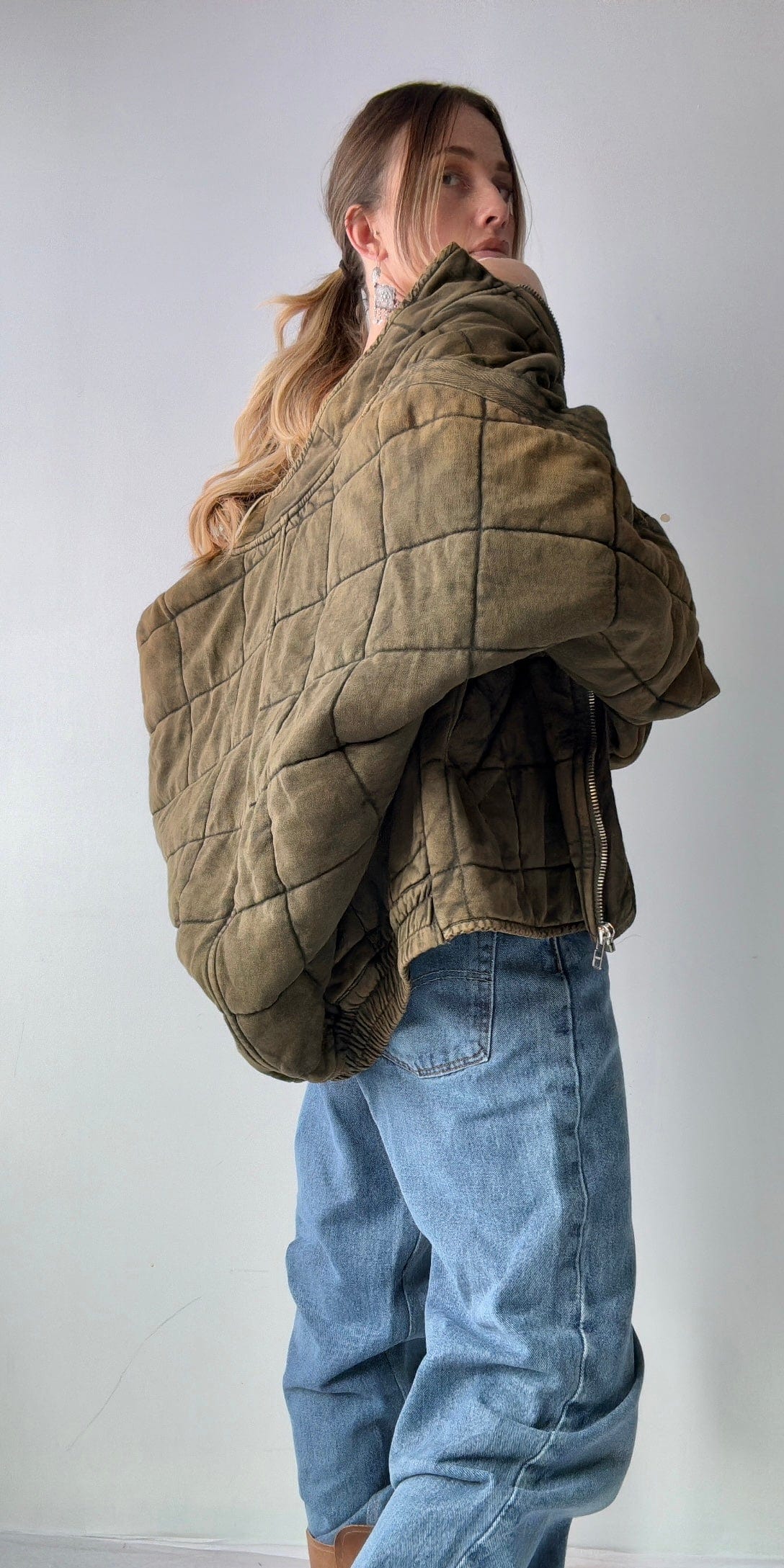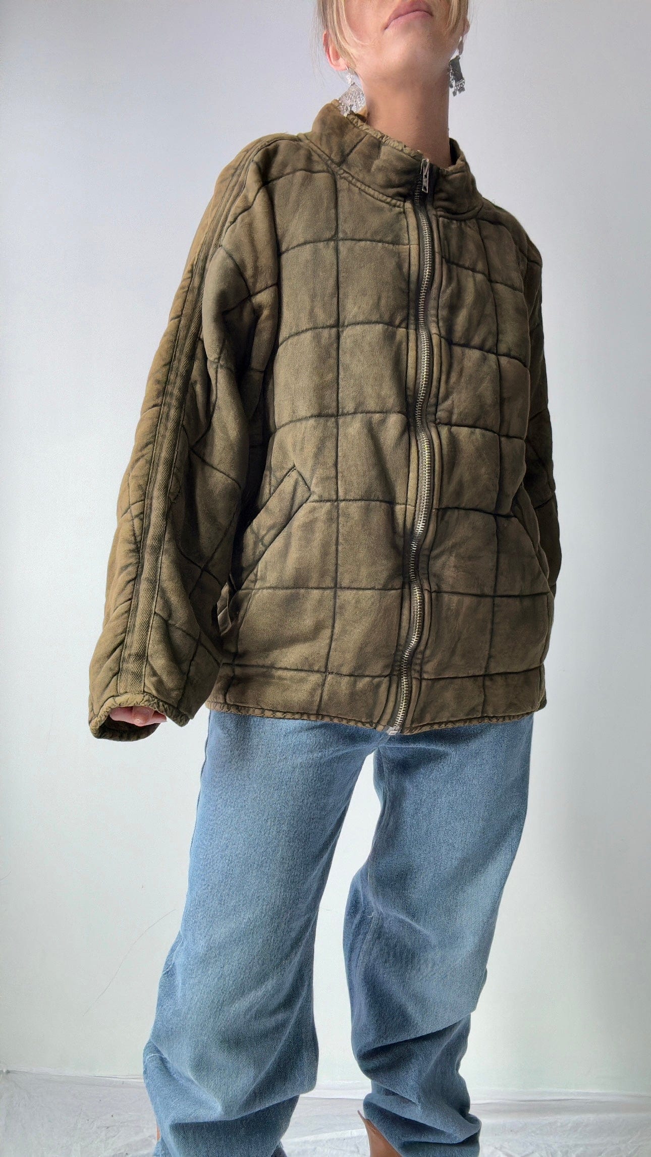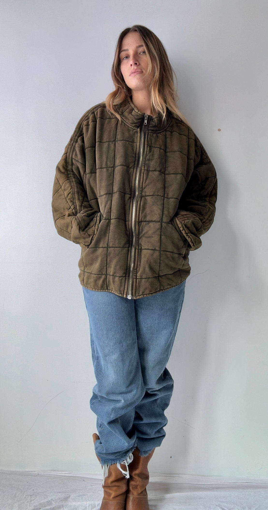 Iconic zip front bomber style jacket with subtle quilted pattern best seller from Free People. Such a goodie has raglan sleeve and bat wing arm. Super cosy with just the right slouch in a distressed cotton knit. Cool street wear or over active wear. Model is 1.74cm and NZ size 8/10 wearing over size
