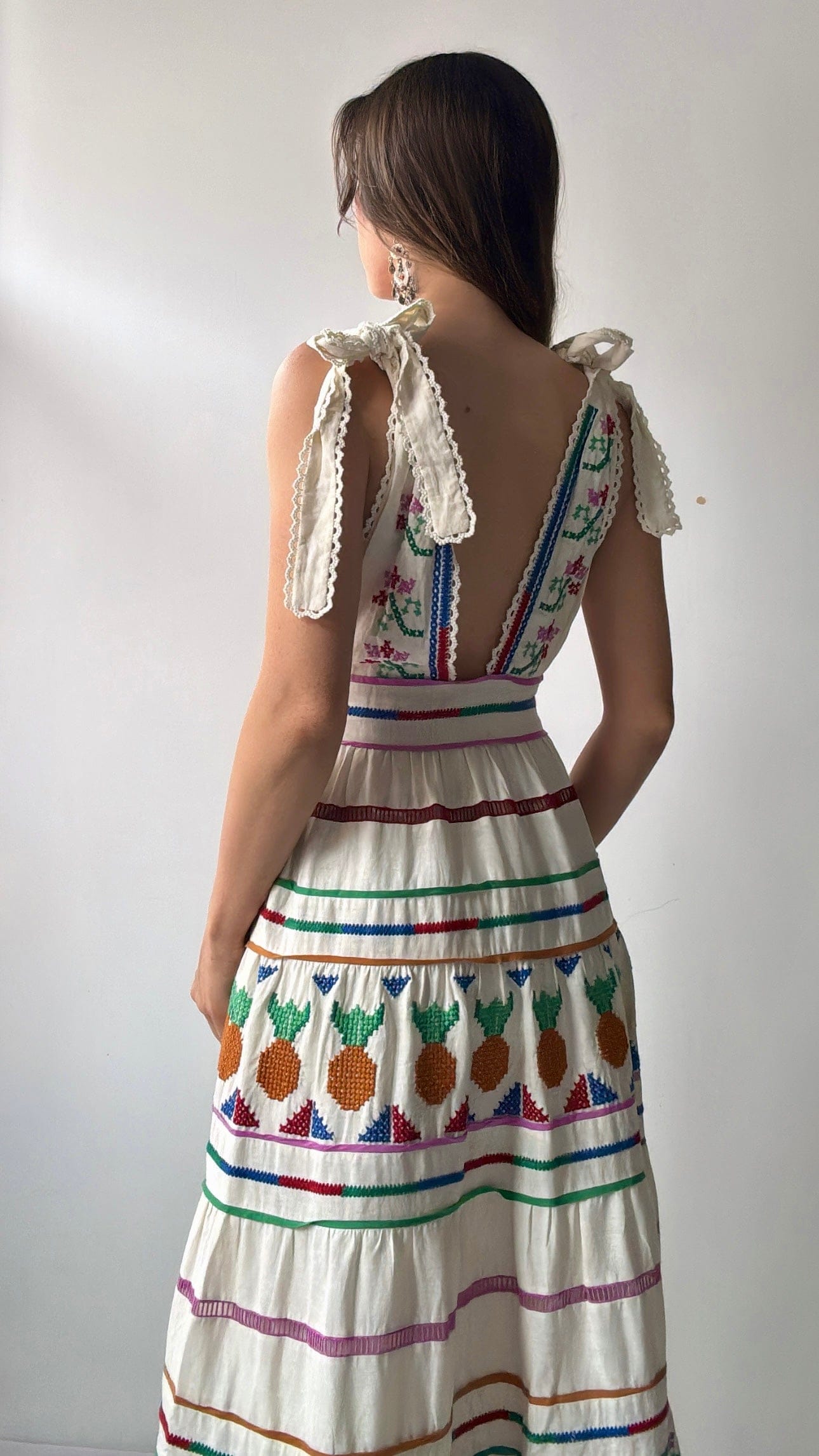 Stunning to the floor cotton maxi dress from Brazilian designer Farm Rio. Tie up straps and amazing embroidered details makes this summer beauty a stand out. Ellie is size 1.74cm NZ8/10 and wearing the small