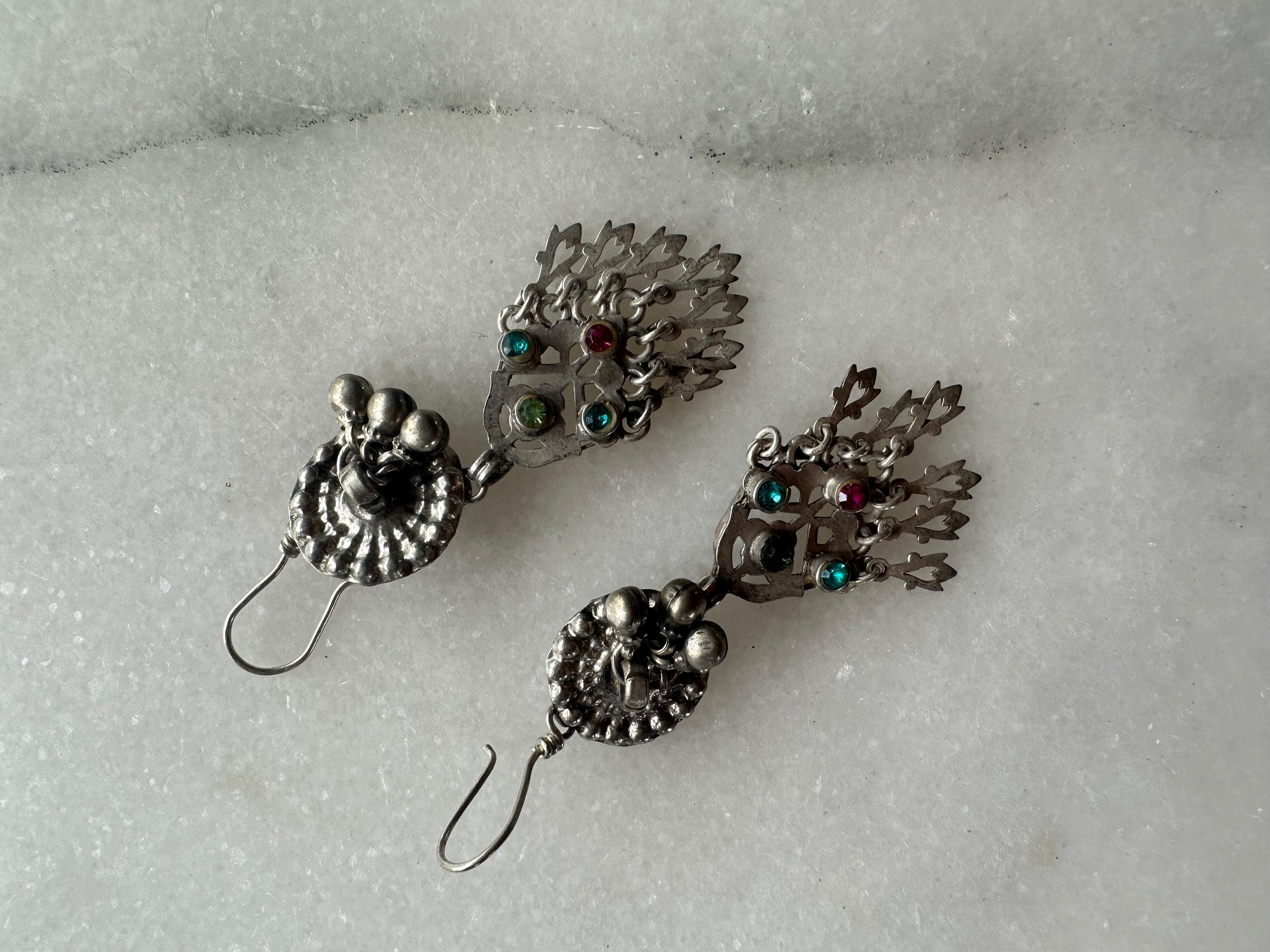 Vintage tribal handmade Indian silver earrings. Intricate patterns attest to the craftsmanship of these traditionally made heirloom pieces.