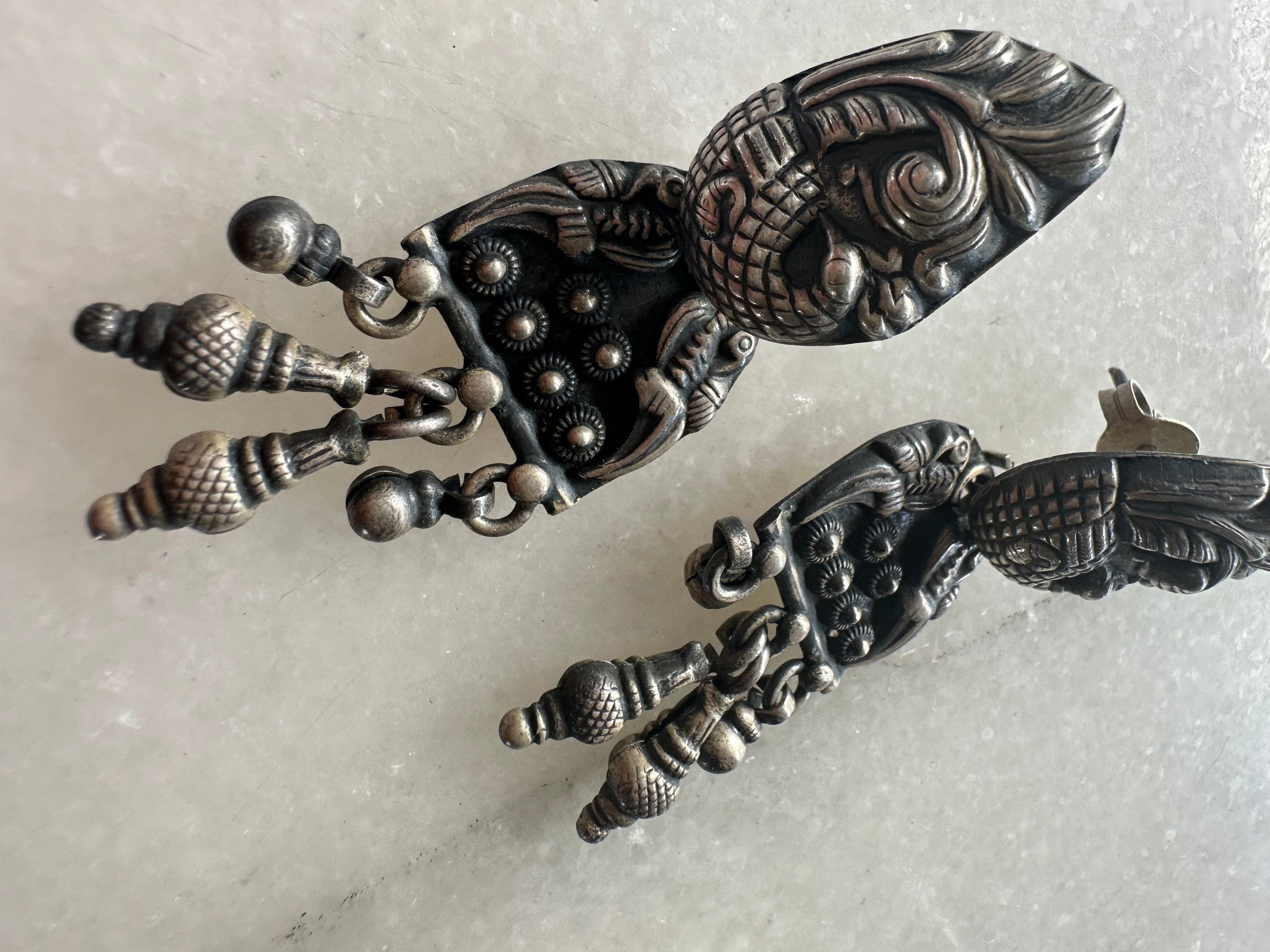 Vintage tribal handmade Indian silver earrings. Intricate patterns attest to the craftsmanship of these traditionally made heirloom pieces.