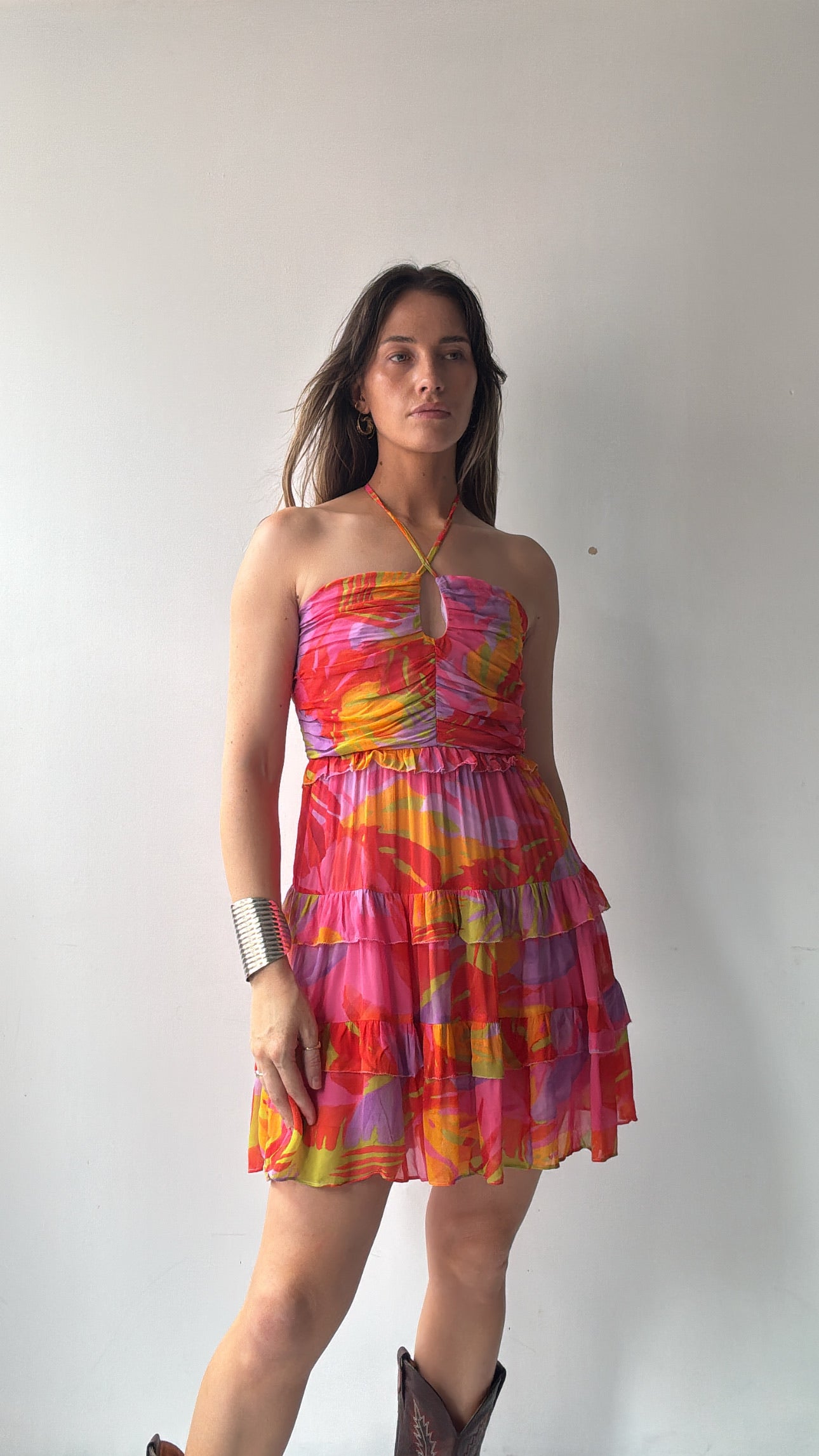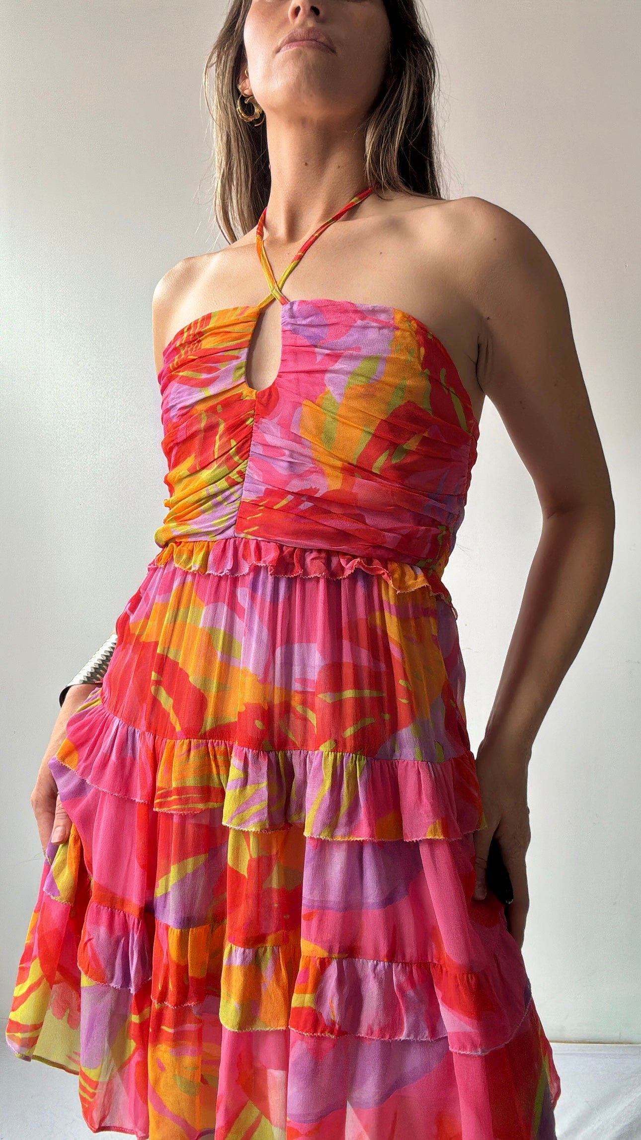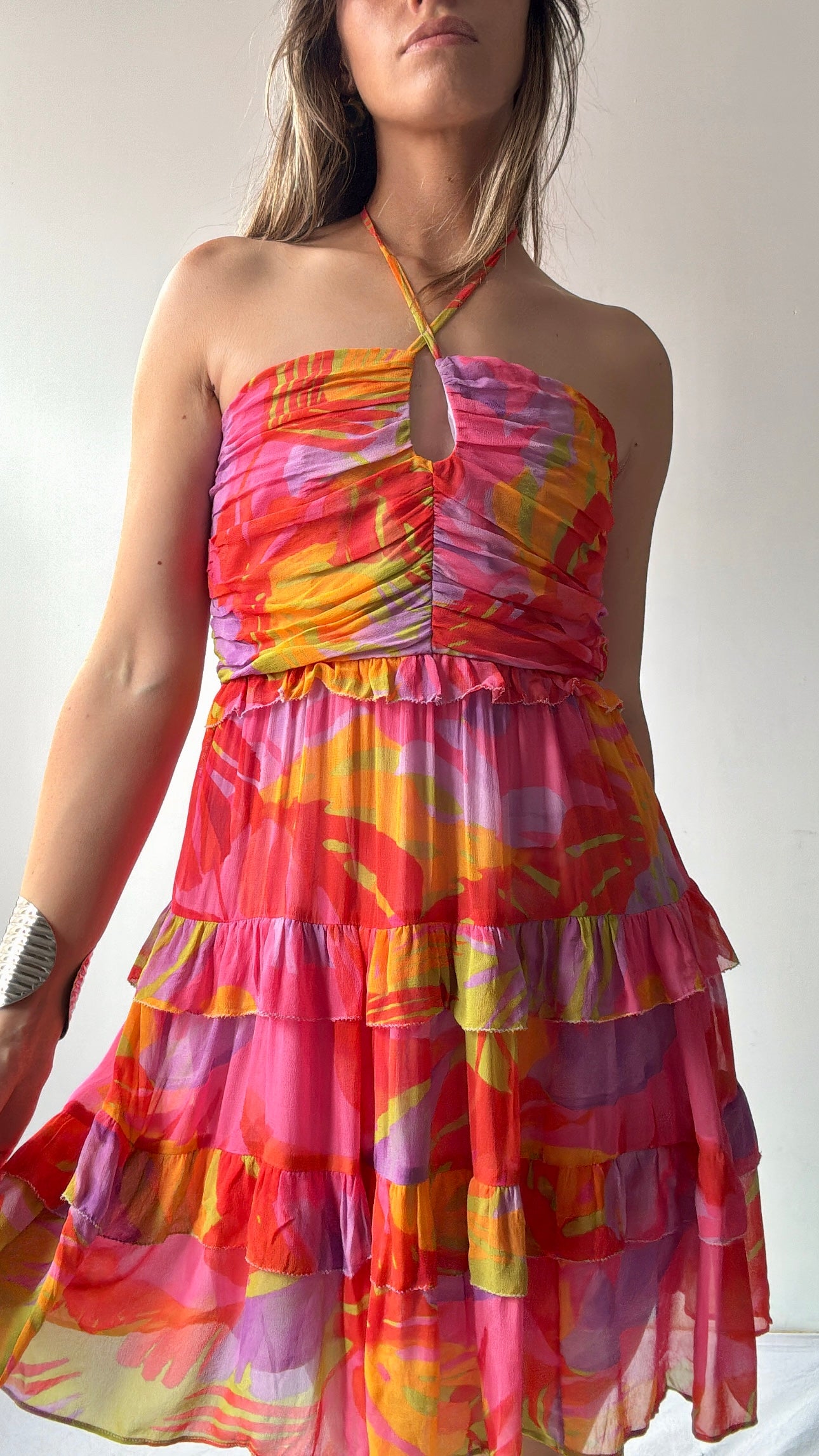 Brazilian designer Farm Rio’s  joyful festive vibe on display in this viscose chiffon shoe string strap mini dress. This super feminine festive coloured piece is the perfect summer addition. Gorgeous ruched bodice make this one off stand out from the crowd.  Ellie is 1.74cm tall and size NZ8/10 and is wearing the NZ10 (small).