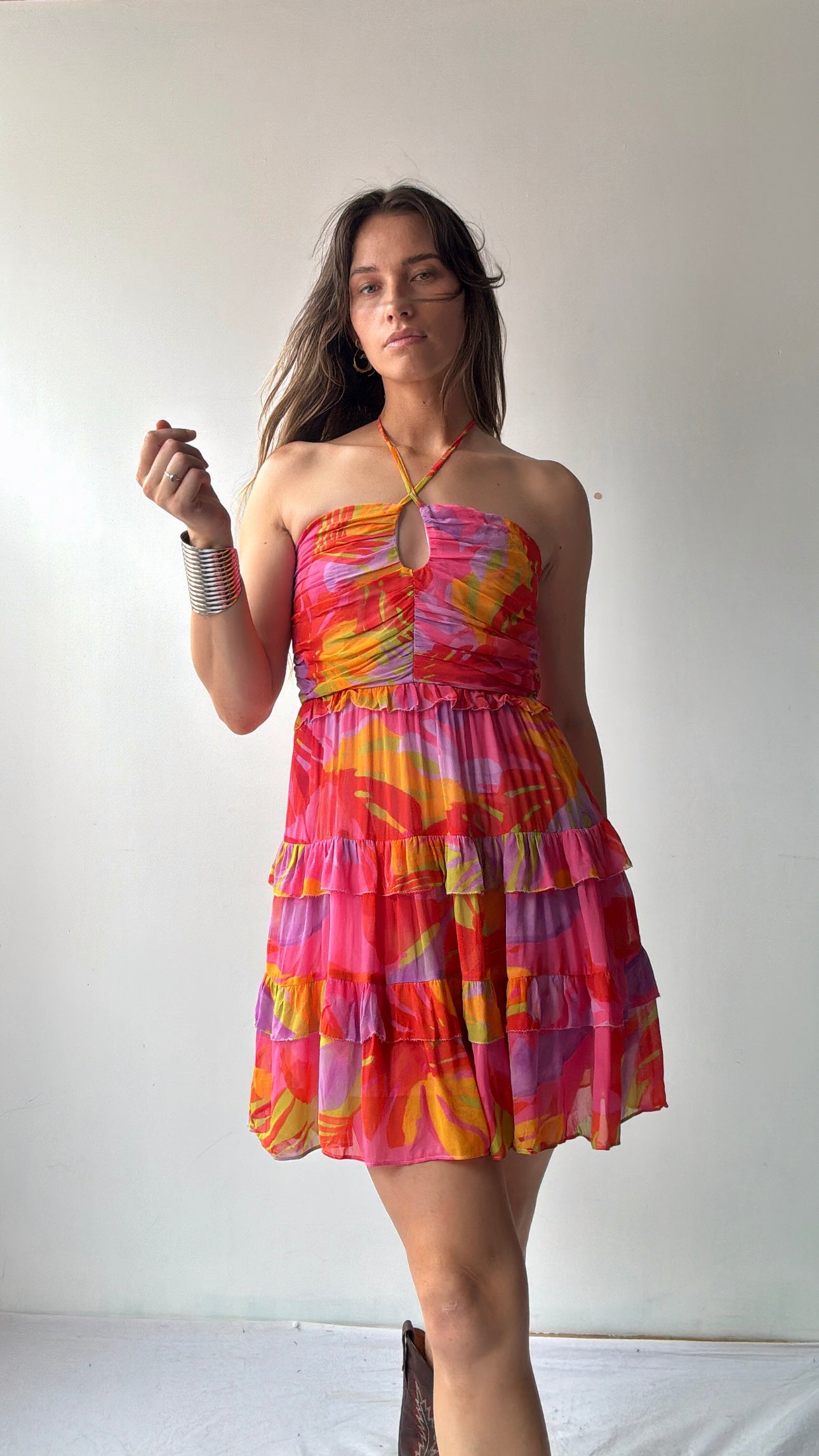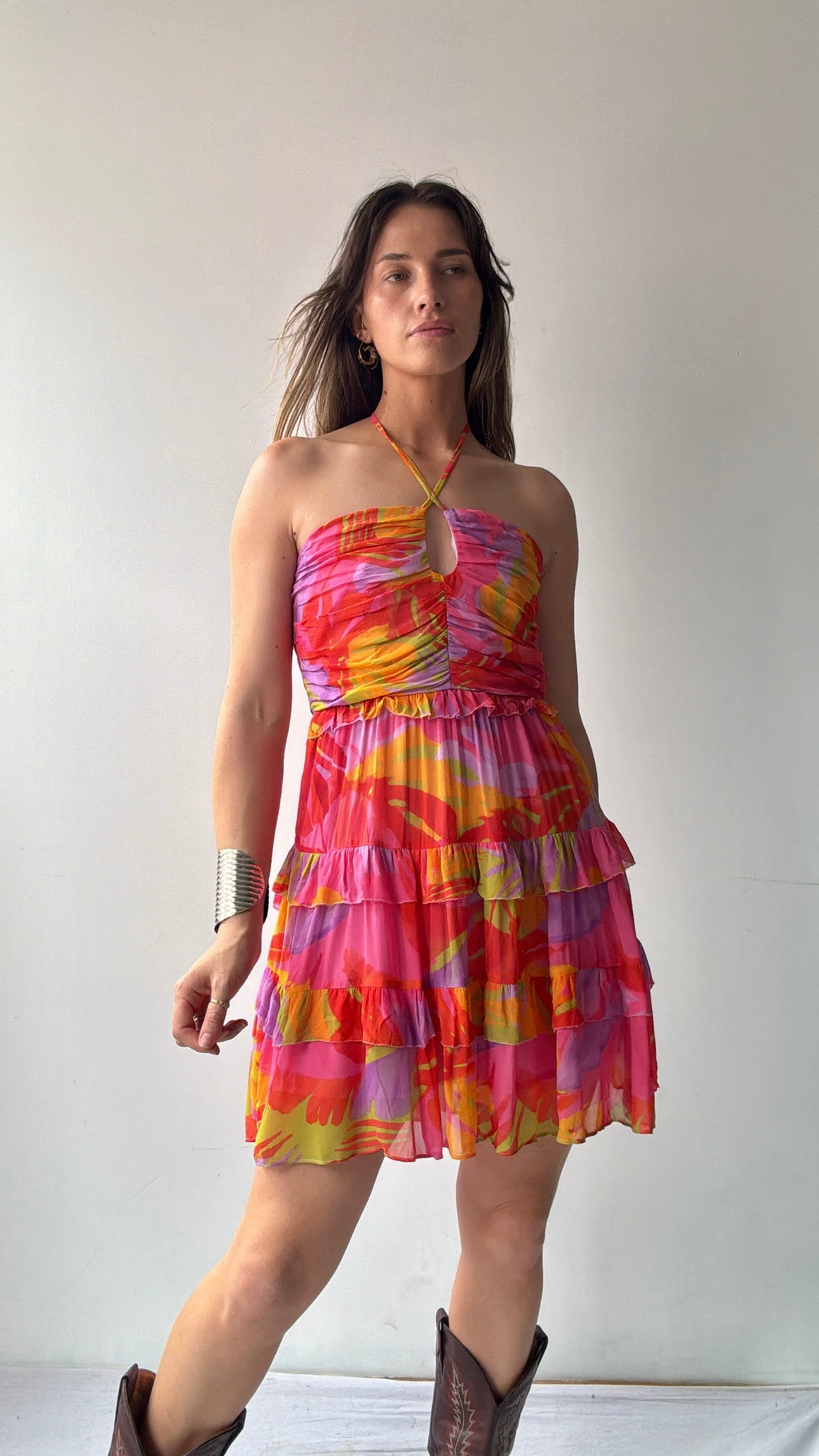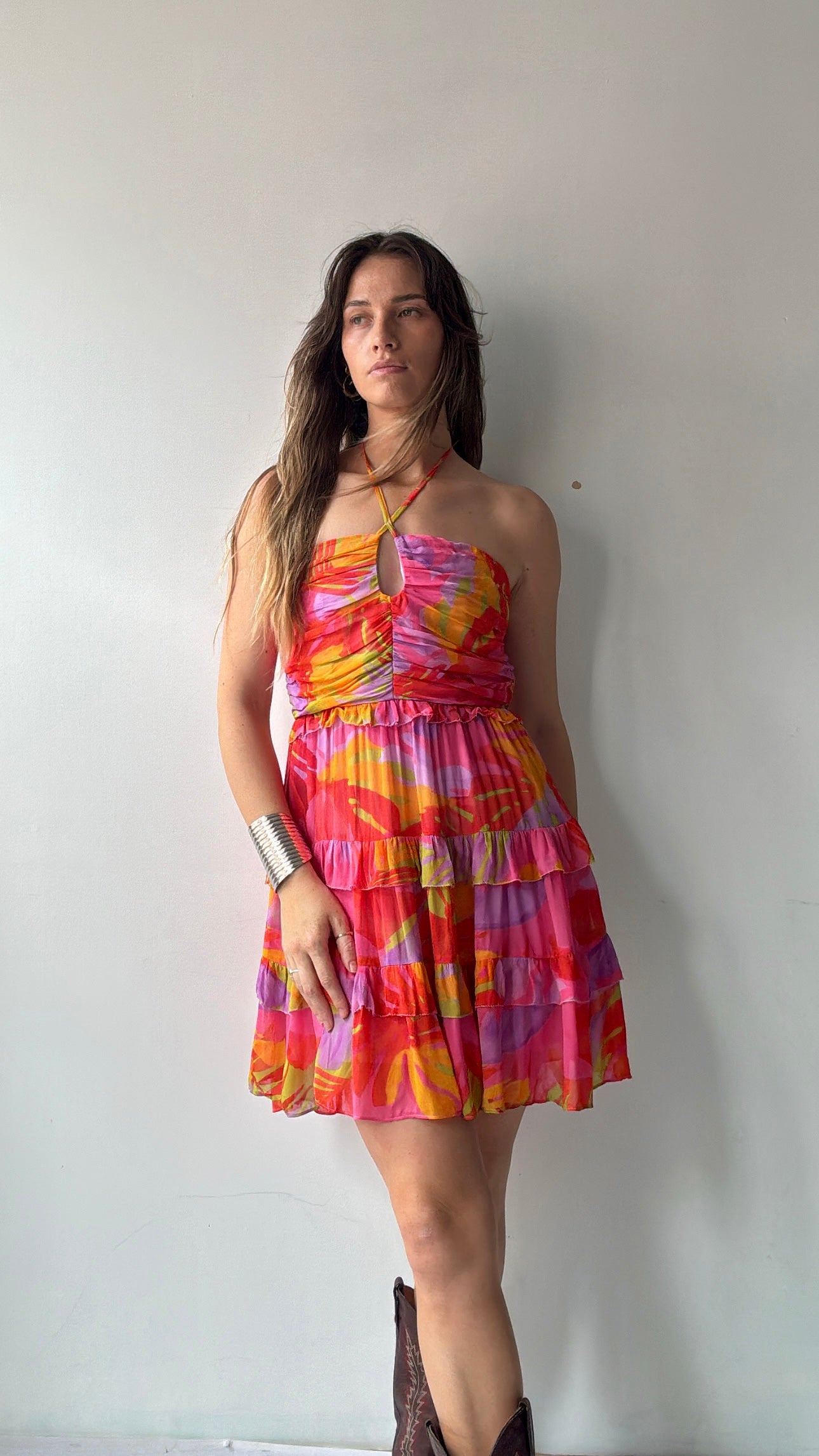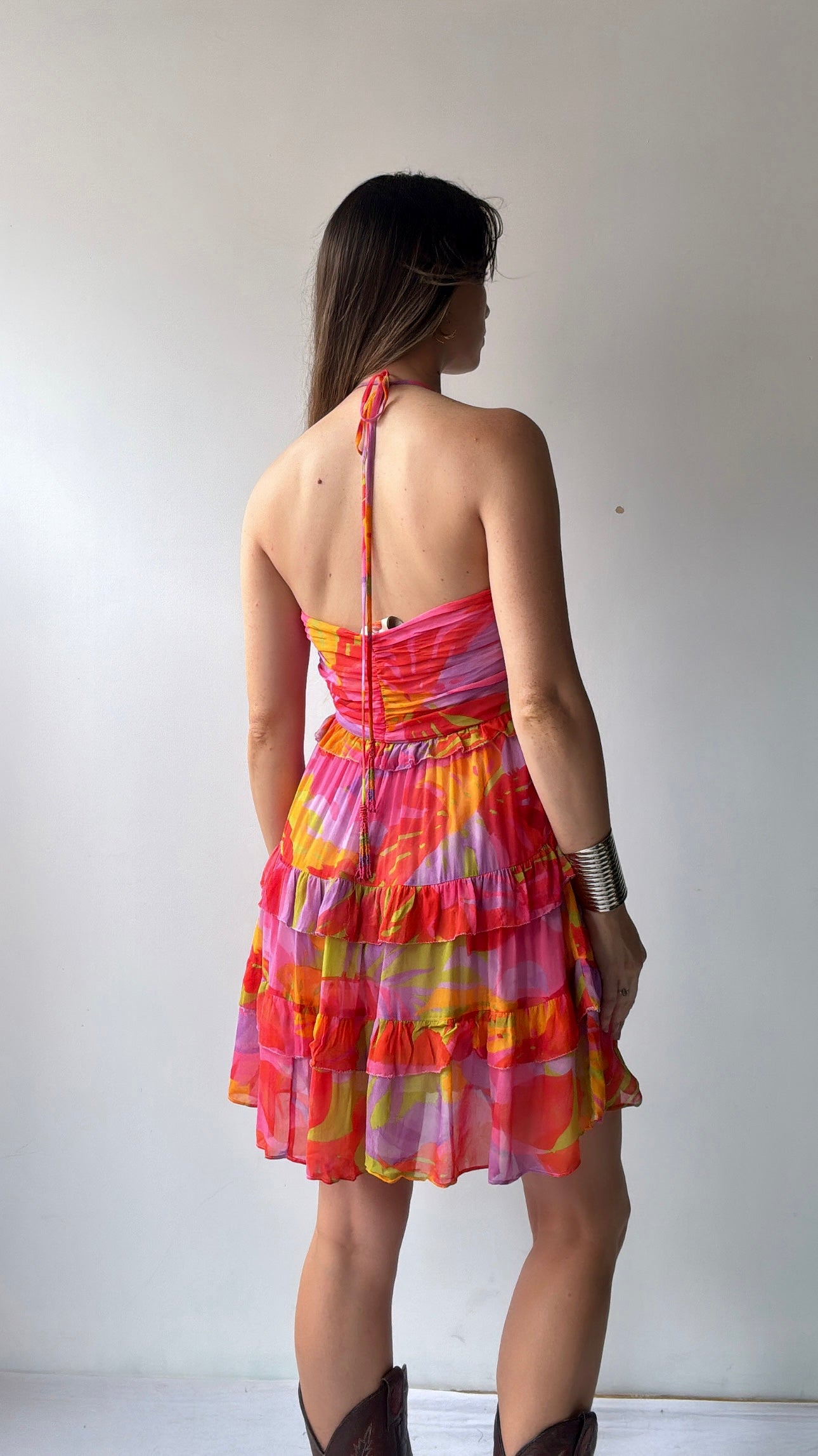 Brazilian designer Farm Rio’s  joyful festive vibe on display in this viscose chiffon shoe string strap mini dress. This super feminine festive coloured piece is the perfect summer addition. Gorgeous ruched bodice make this one off stand out from the crowd.  Ellie is 1.74cm tall and size NZ8/10 and is wearing the NZ10 (small).
