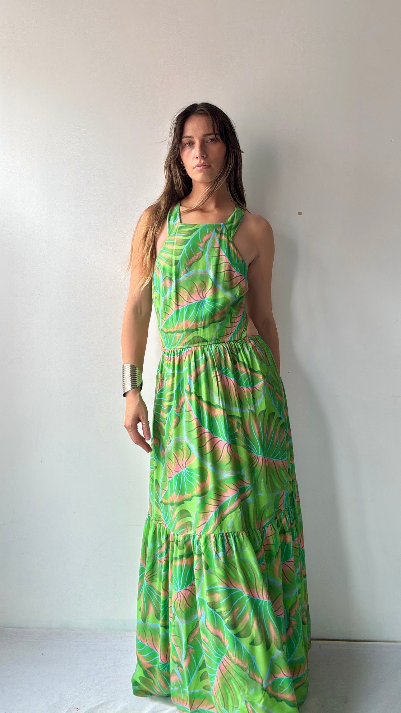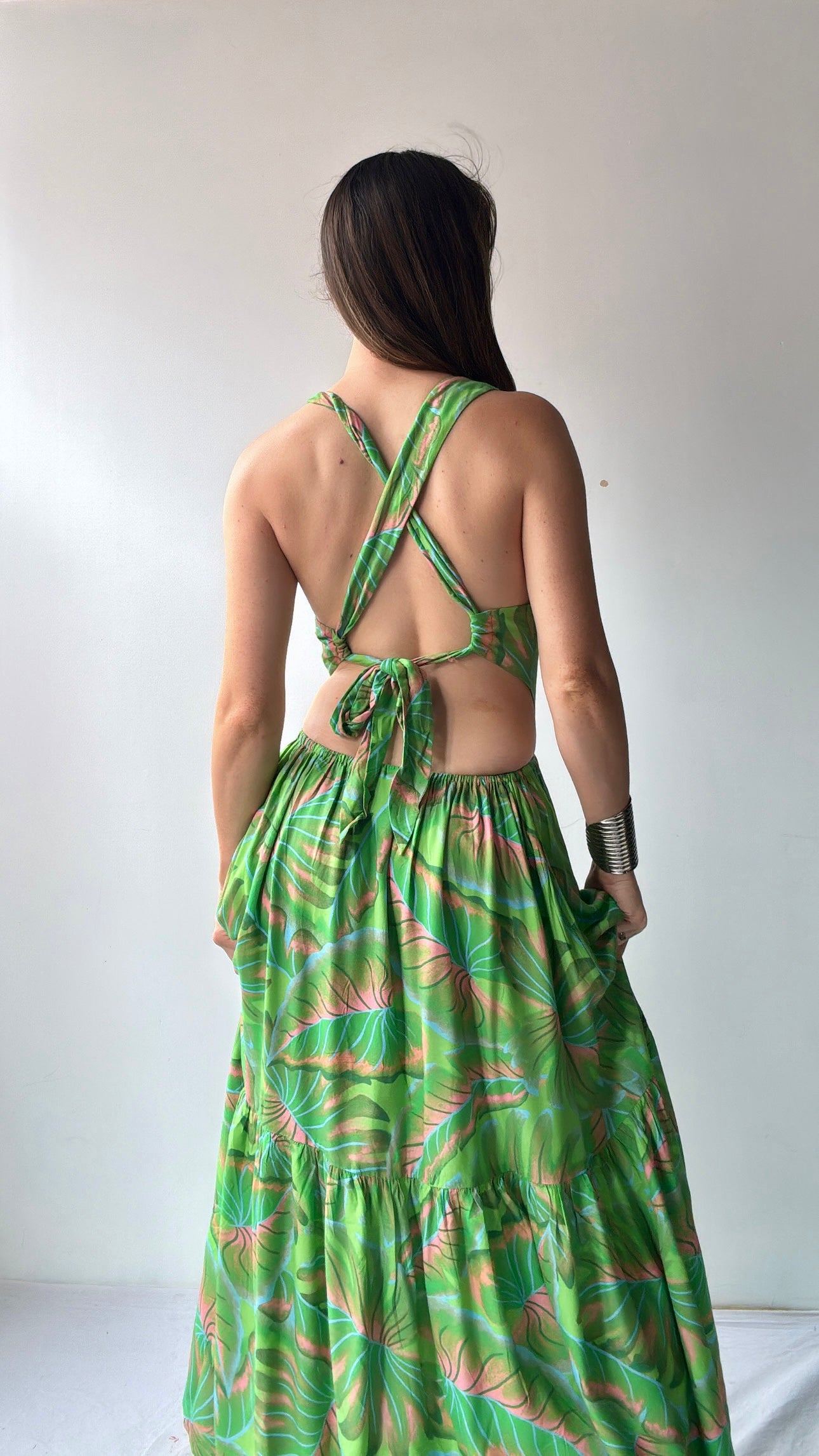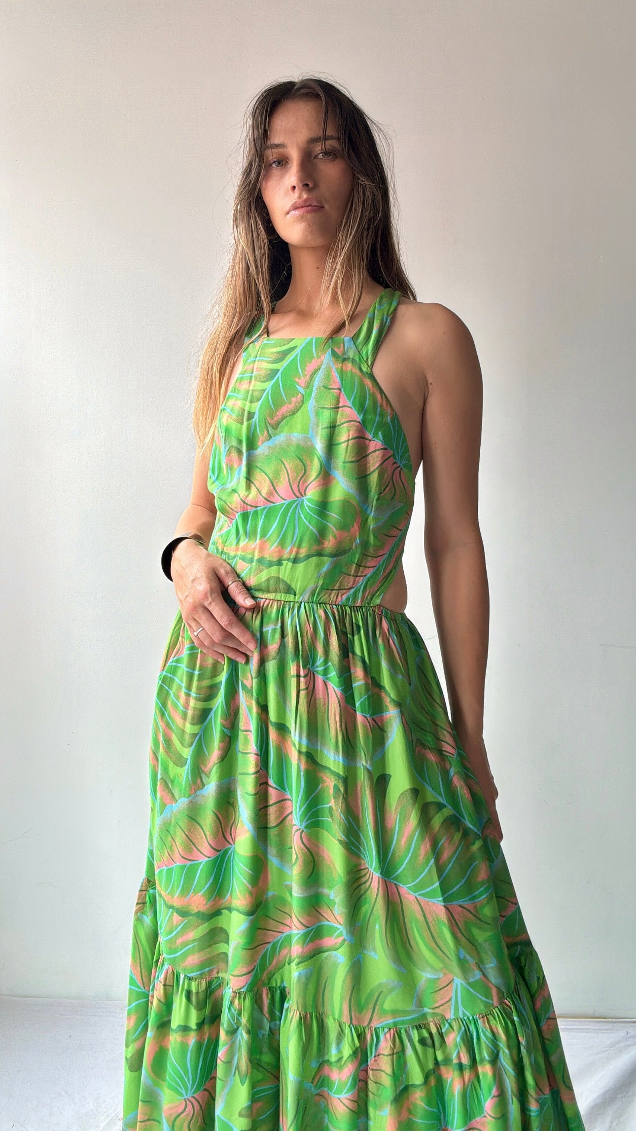 Fresh tropical print  cotton Farm Rio summer dress. Elastic waist, open back, cross over straps and tiered maxi skirt. Our model Elly is 1.74cm a NZ 8/10 and wearing the xs but would suit a small as well