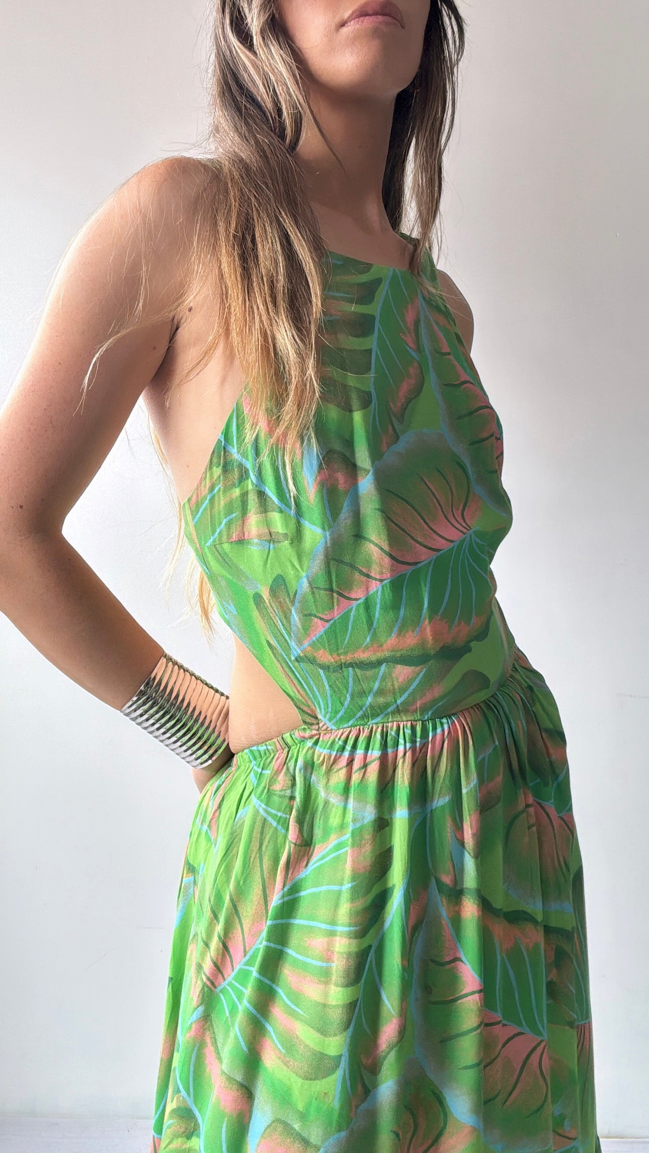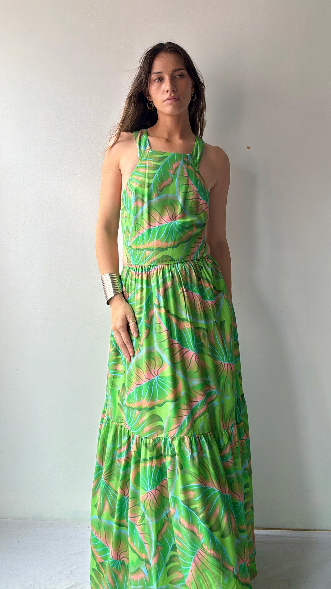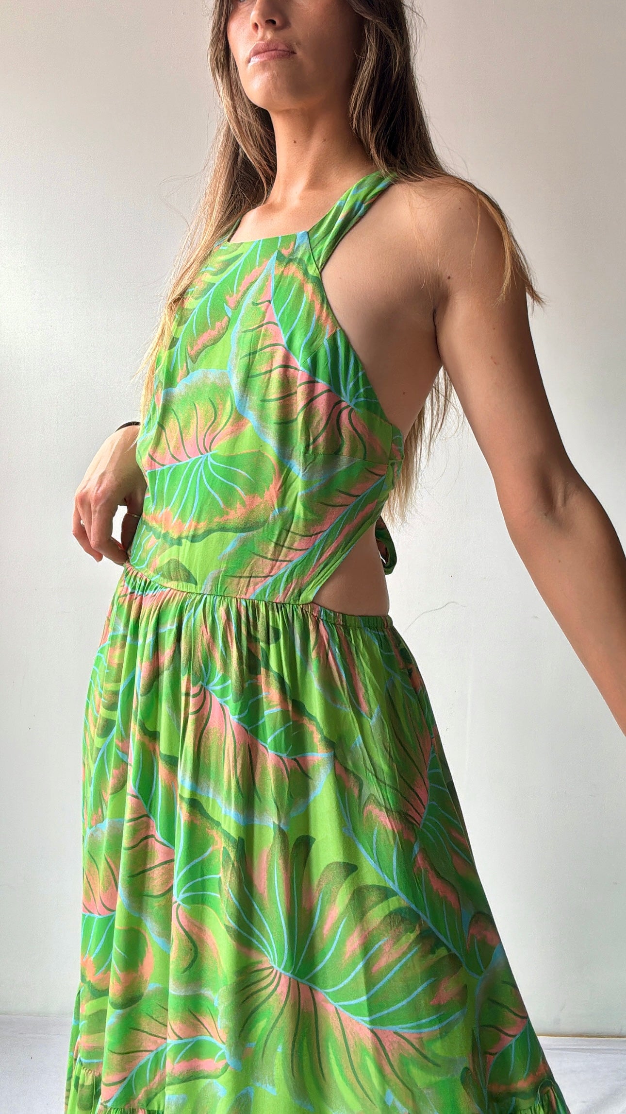 Fresh tropical print  cotton Farm Rio summer dress. Elastic waist, open back, cross over straps and tiered maxi skirt. Our model Elly is 1.74cm a NZ 8/10 and wearing the xs but would suit a small as well