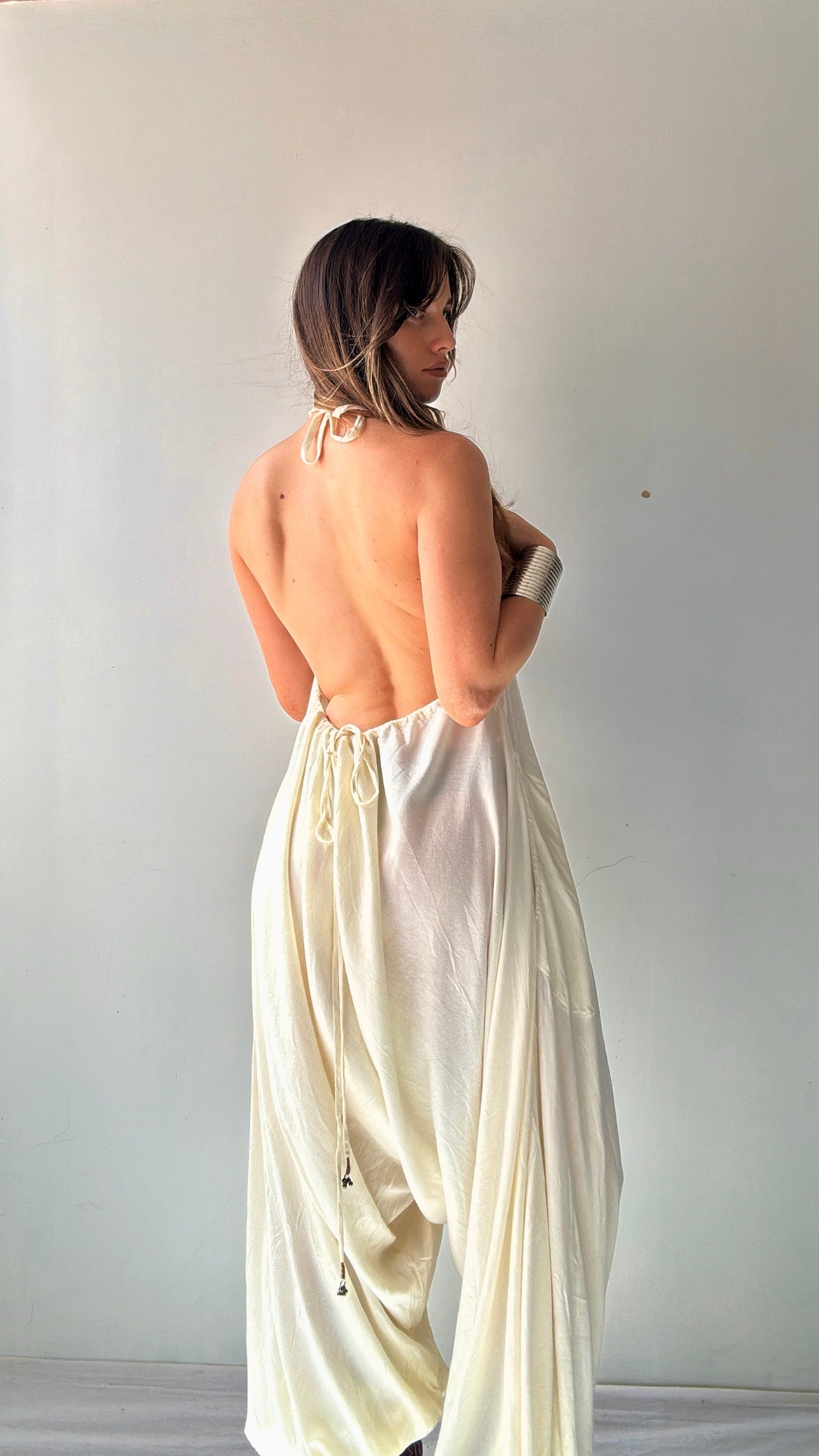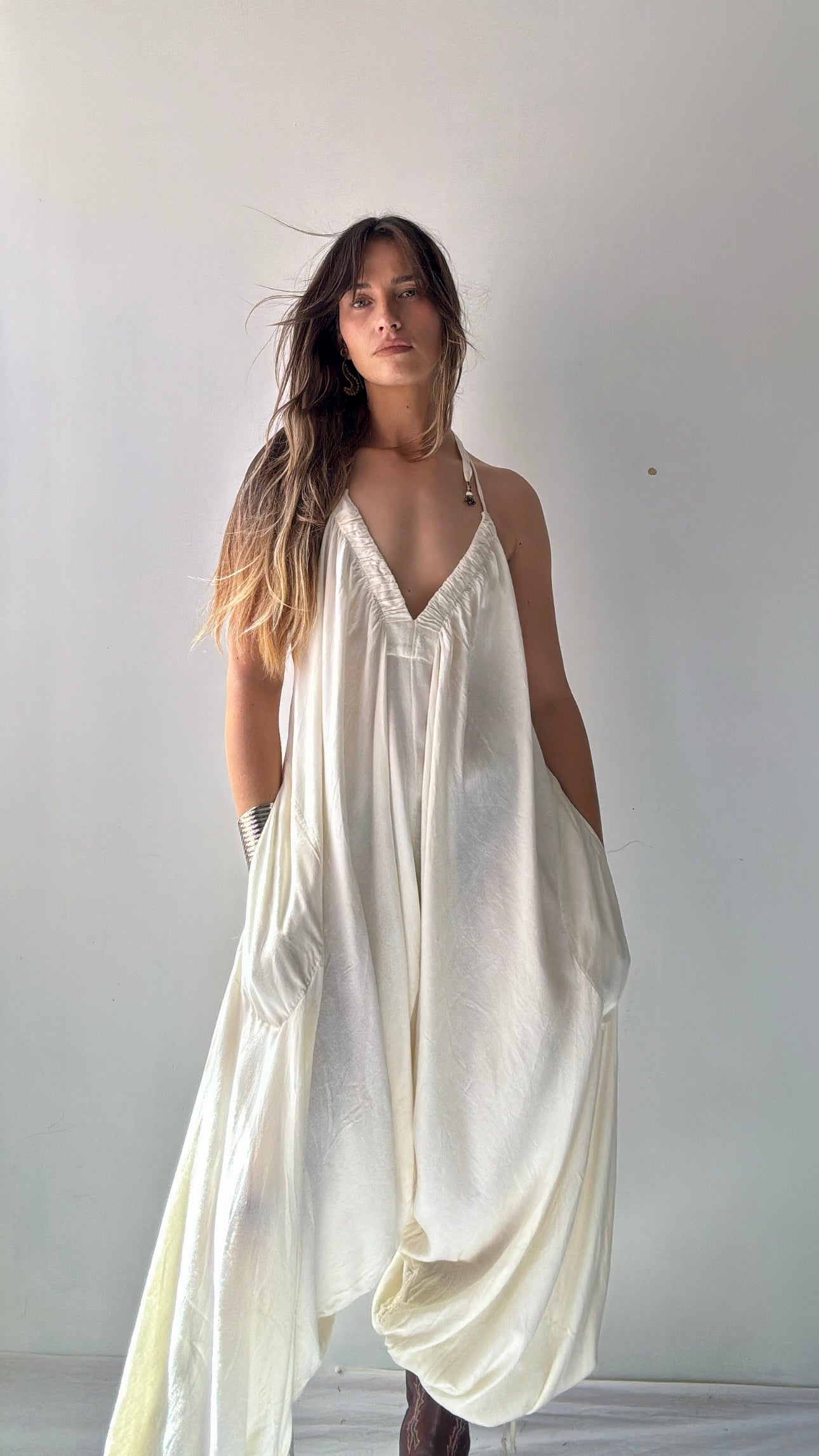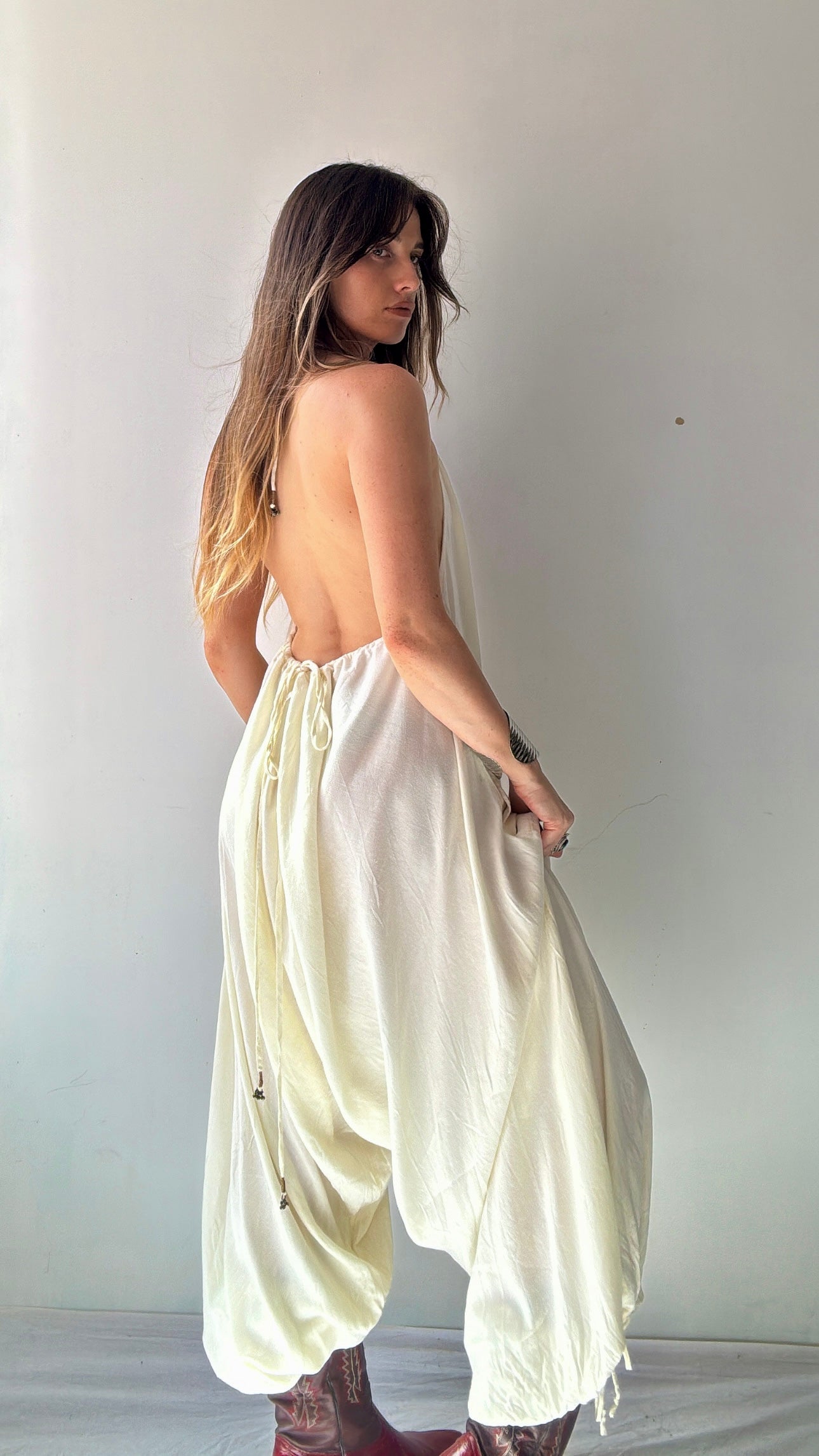 Amazing slouchy signature Free People style jumpsuit. Dropped crutch, harem style with bare, adjustable back, tied halter neck amd the all important pockets. Model is 1.74cm and a NZ 8/10 wearing the small. The small can actually accommodate and XL