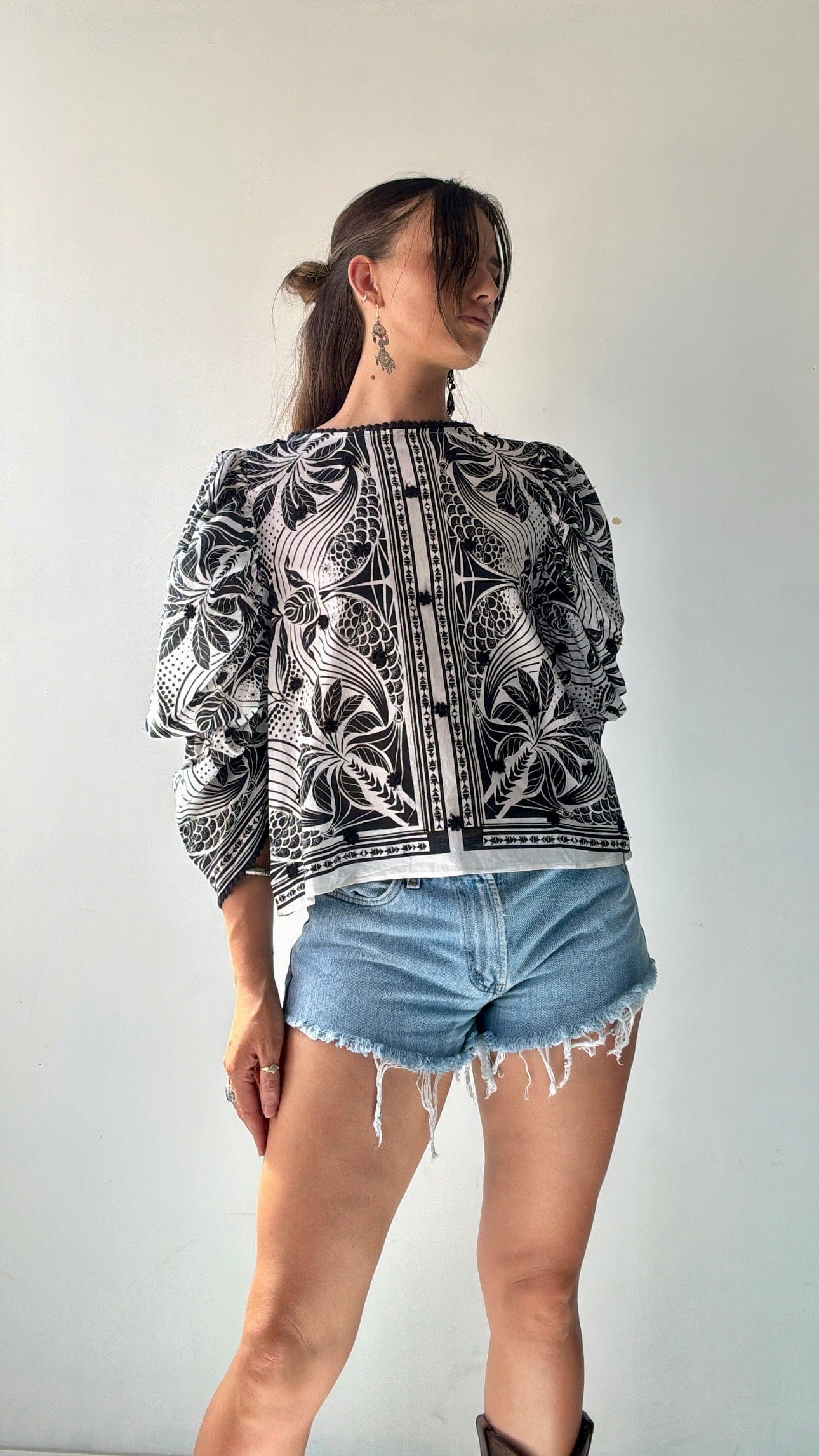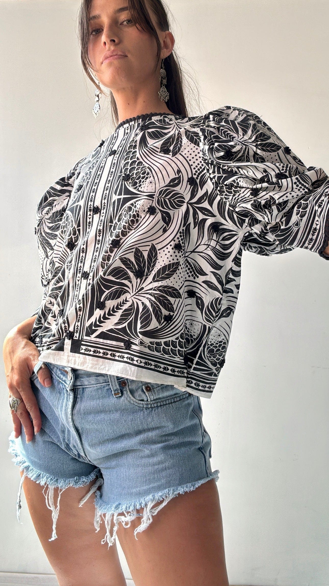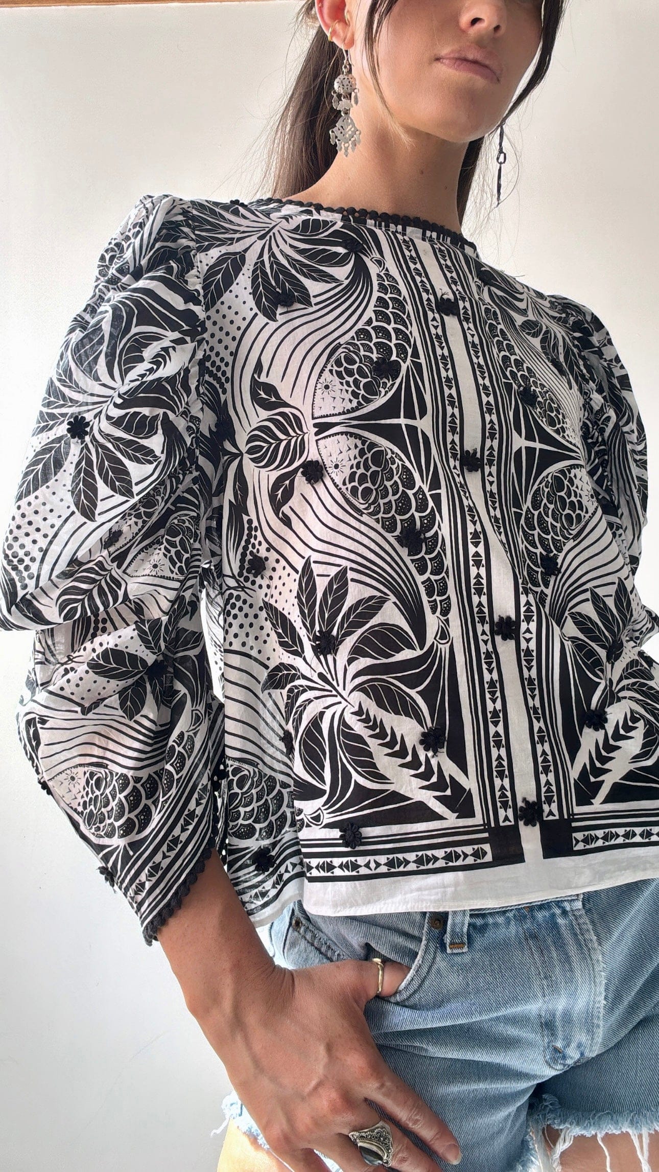 Brazilian designer Farm Rio’s joyful festive vibe on display in this 100% fine cotton cropped top. This vibrant piece is the perfect summer addition with its beautiful puffed sleeves embroidered details and beaded feature back buttons. Ellie is 1.74cm and size NZ 8/10 and is wearing the NZ10 (small).