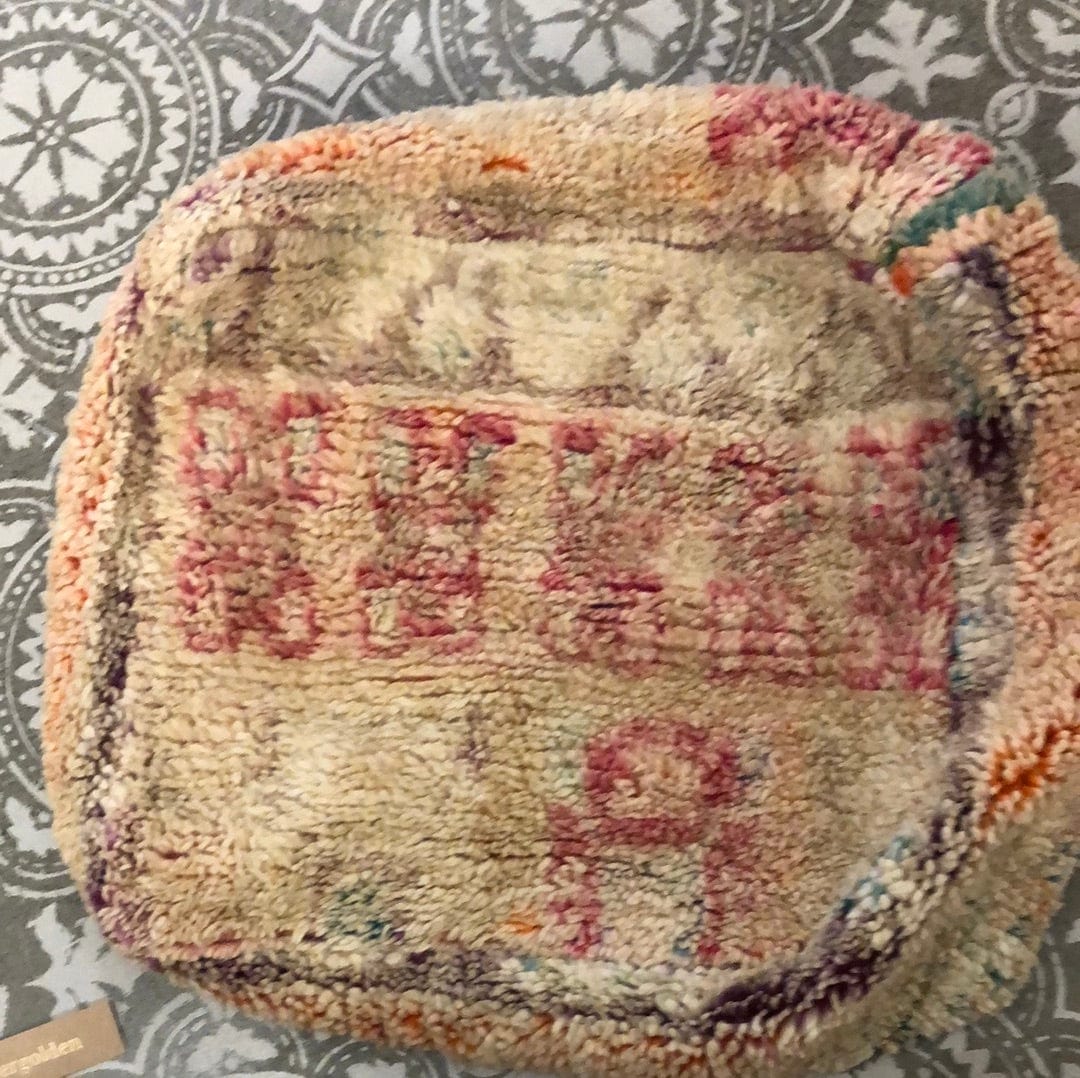 One of a kind, hand made pouf from Morocco made using upcycled hand knotted vintage kilim. Approximately 60x60cm and 20cm high. Comes stuffed