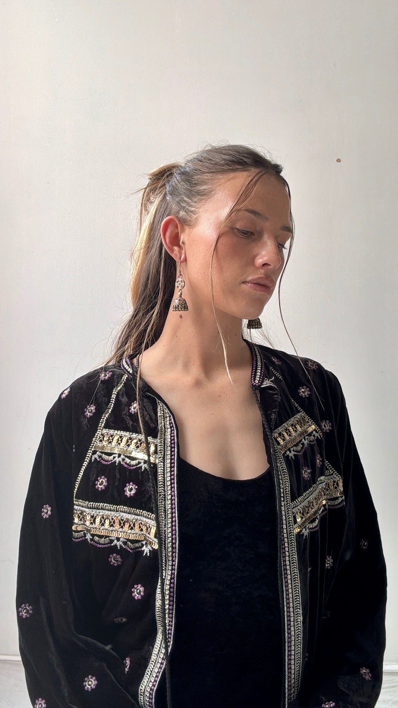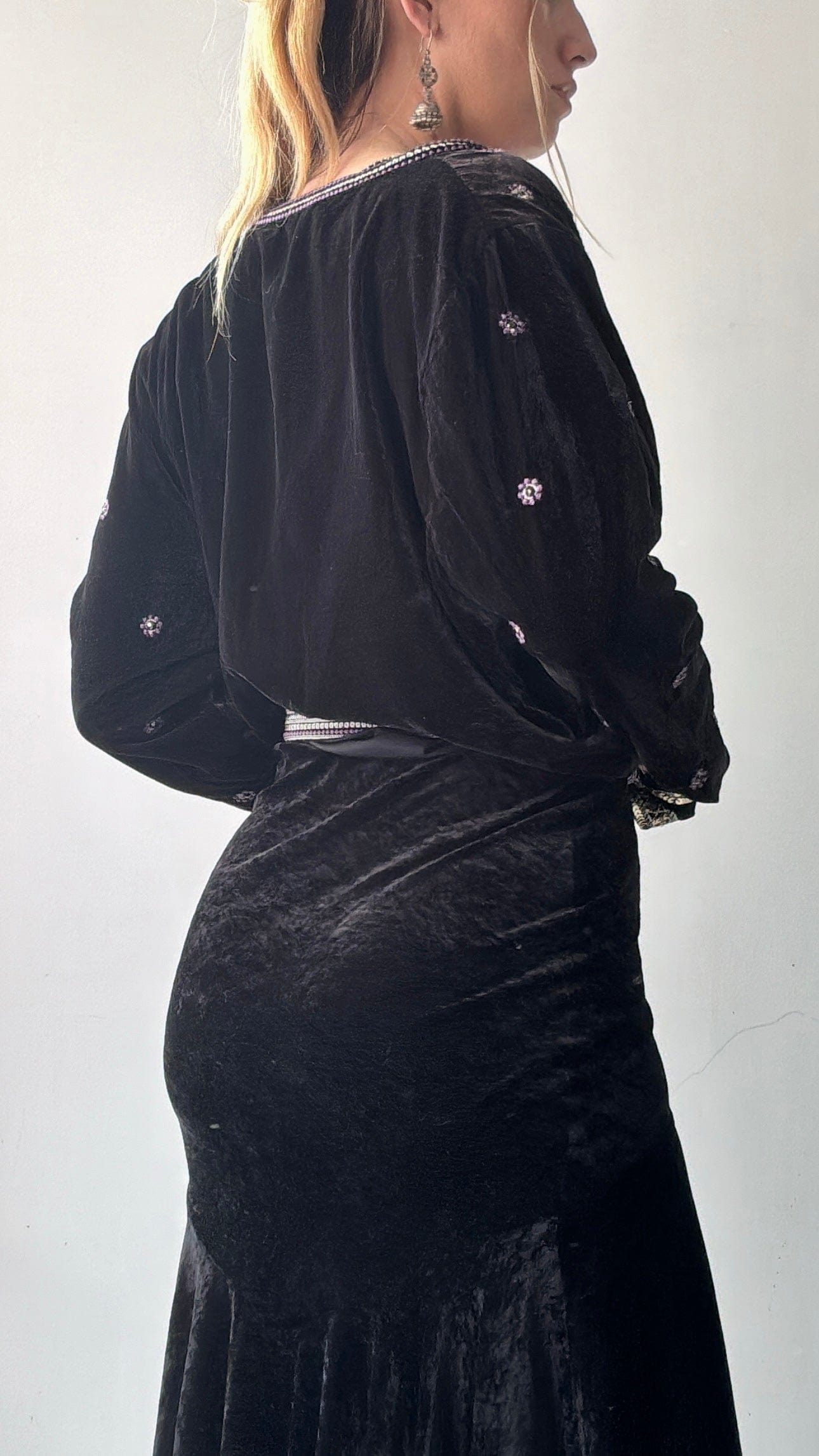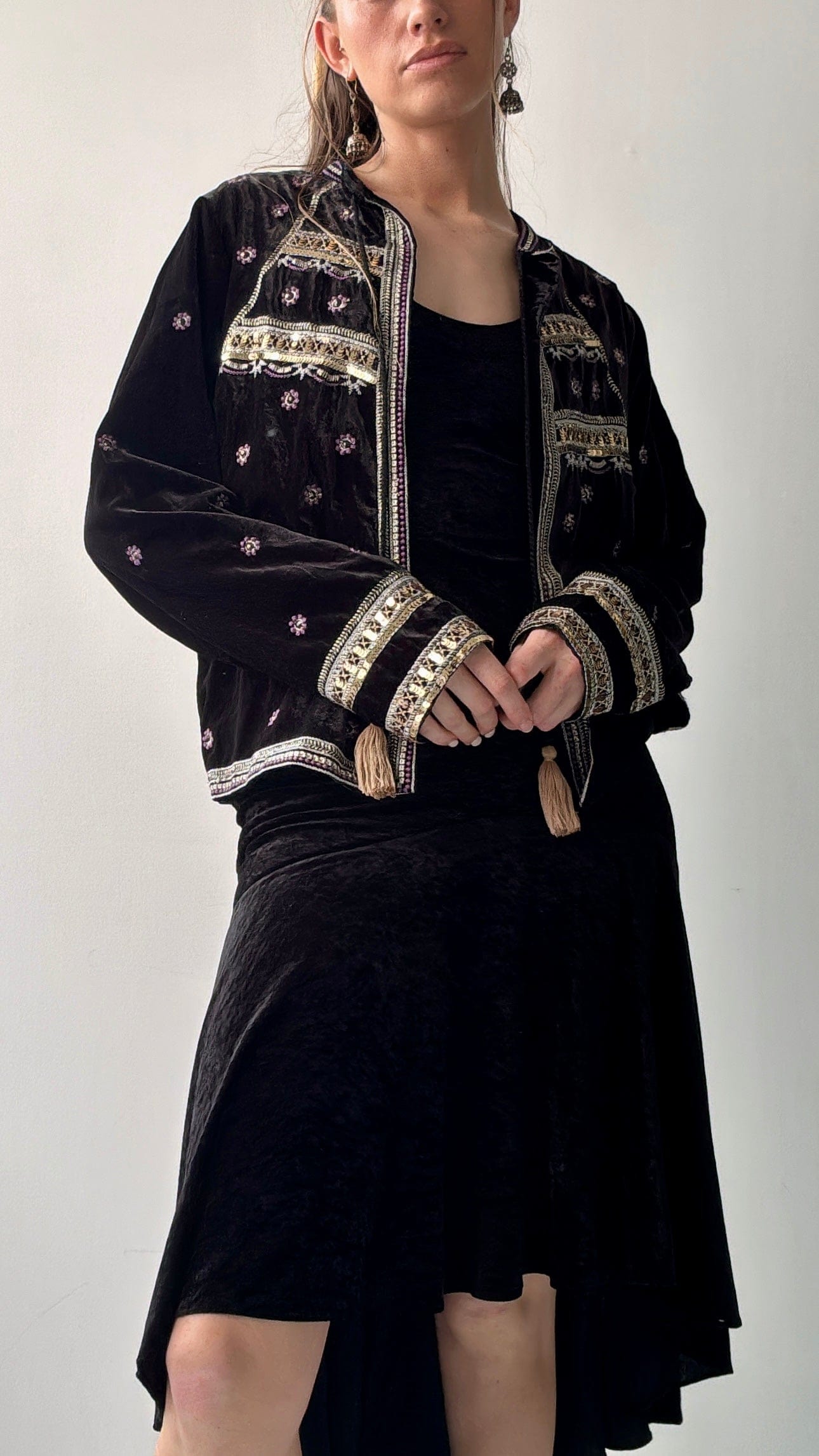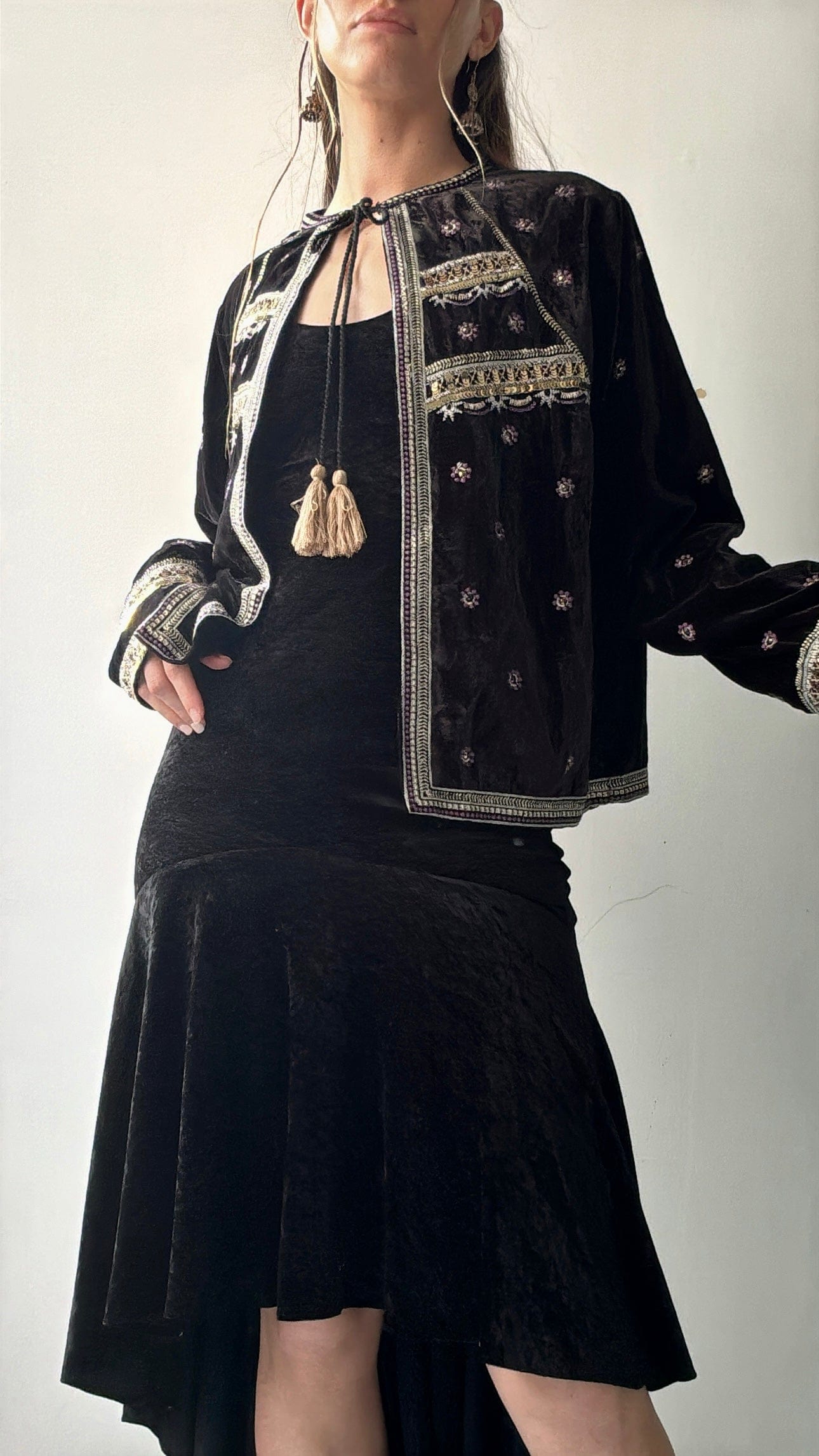 Luxe silk velvet embellished tie up jacket with stunning contrasting embroidery and sequin detail. Model Elly is 1.74cm and a size NZ 8/10 wearing the large.