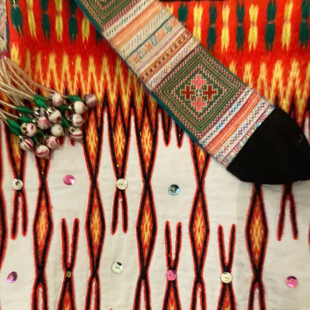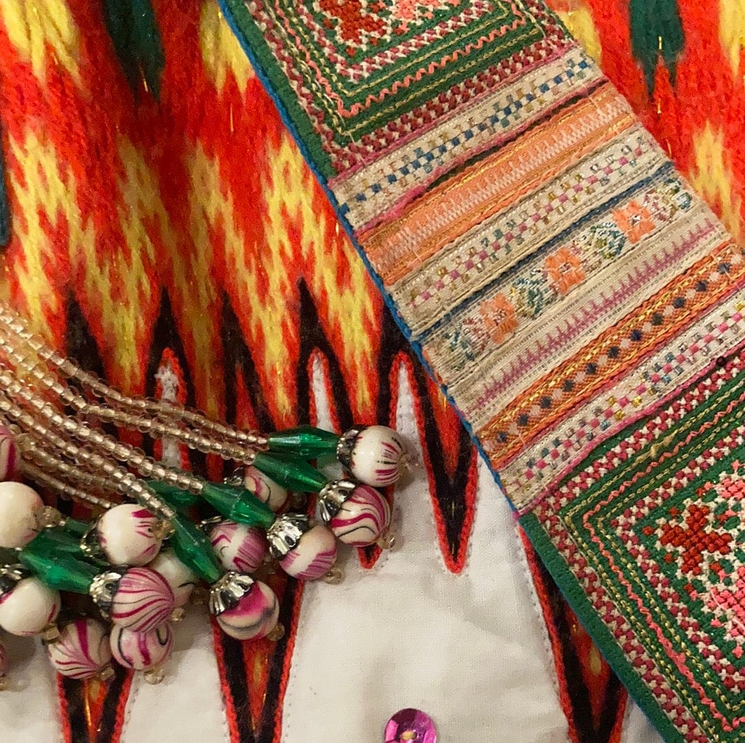 One of a kind handmade Hmong satchel featuring brilliant pieces of remade paj ntaub with a zip top and internal pockets.