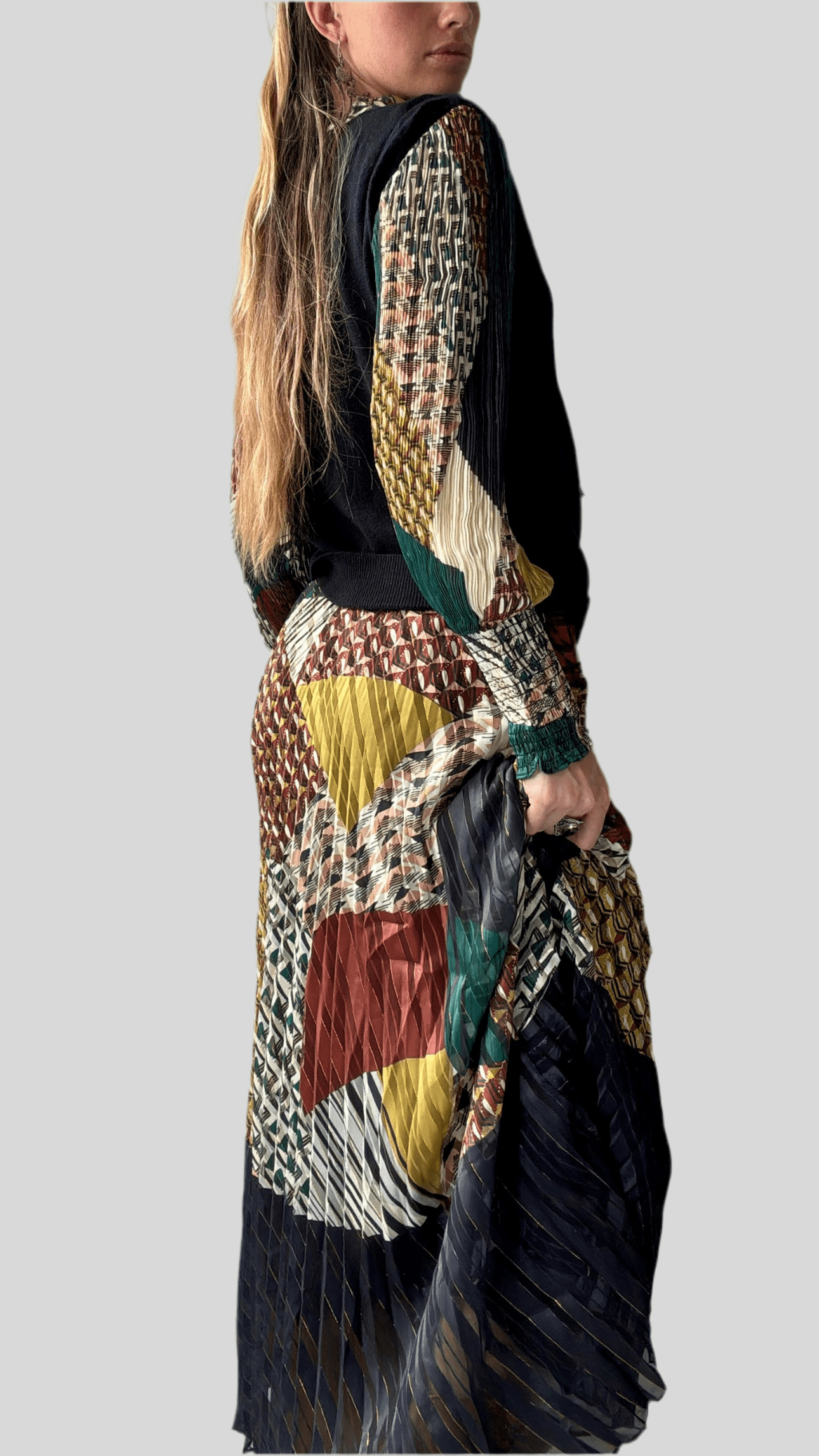 Parisian designed. Feminine wool blend knit top with beautiful sheer print and metallic thread pleated modal sleeves and neck bow. Model is size NZ 8/10. Also check out the matching midi pleated skirt.