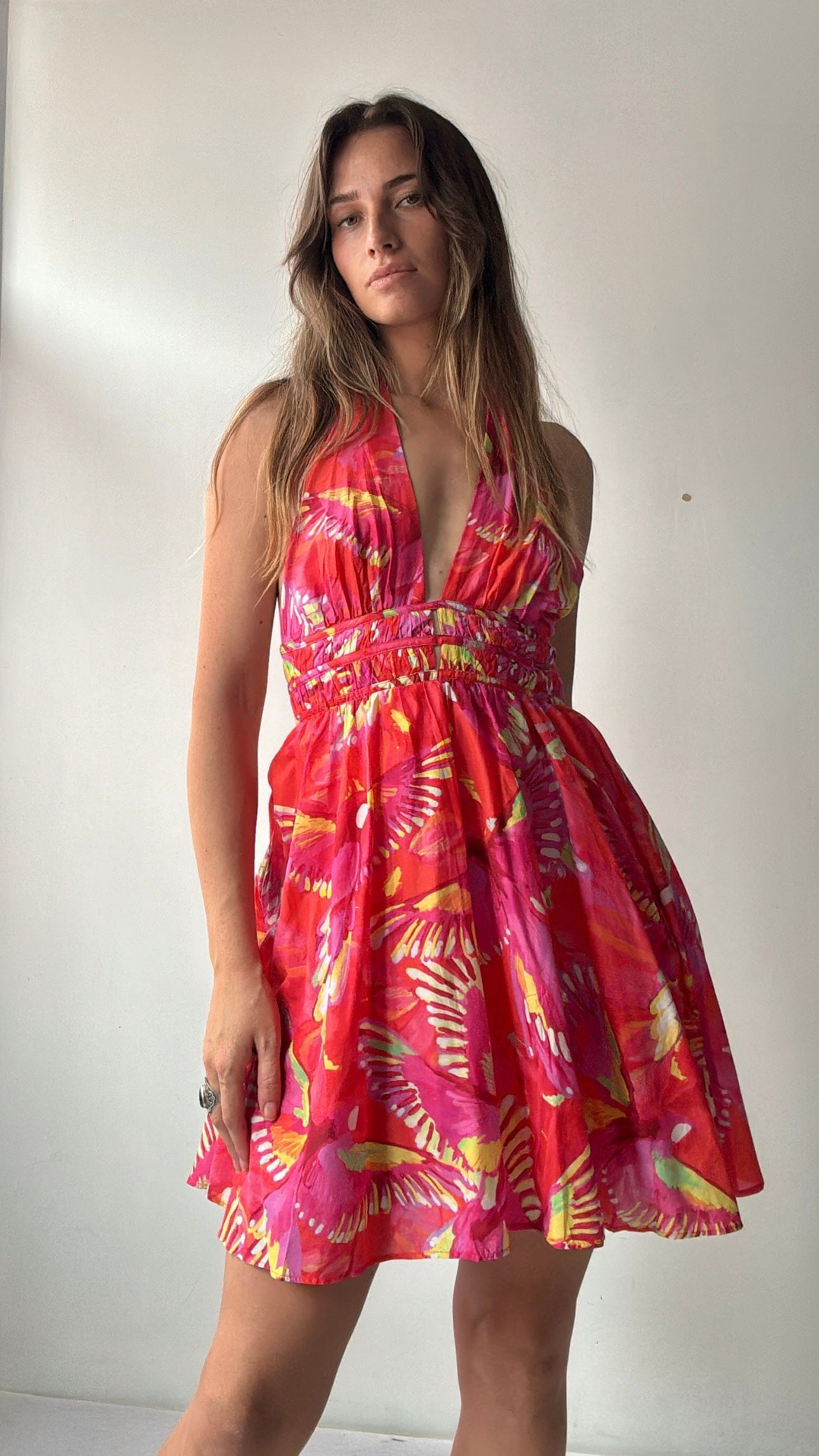 Brazilian designer Farm Rio’s joyful festive vibe on display in this 100% light cotton mini backless sundress with tie up halter neck complete with beaded tassels on the end of the ties. Elly is size 1.74cm NZ8/10.and wearing the small