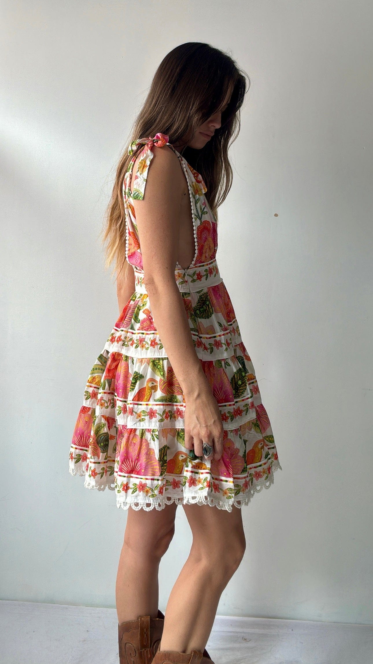 From Brazilian designer Farm Rio, fun printed cotton tiered mini dress with tie up straps. Ellie is size 1.74cm NZ8/10 and wearing the small