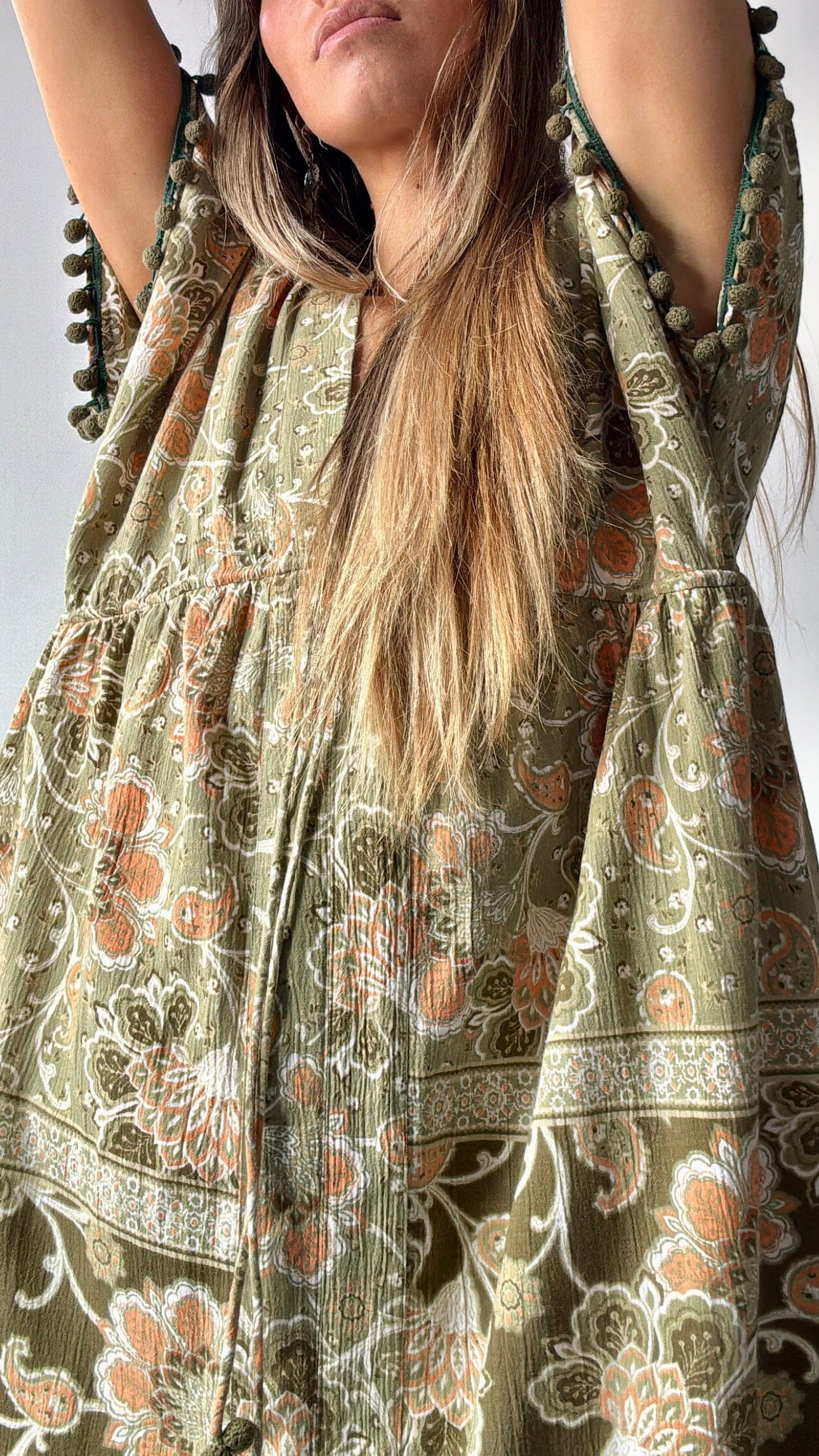 Brazilian designer Farm Rio’s joyful festive vibe on display in this 100% cotton empire line midi dress. Has pom pom detail and draw string. This super feminine soft olive dress is the perfect summer addition. One off. Ellie is size 1.74cm NZ8/10 and is wearing the NZ 10 (small). But could definitely accommodate a size 12-14.