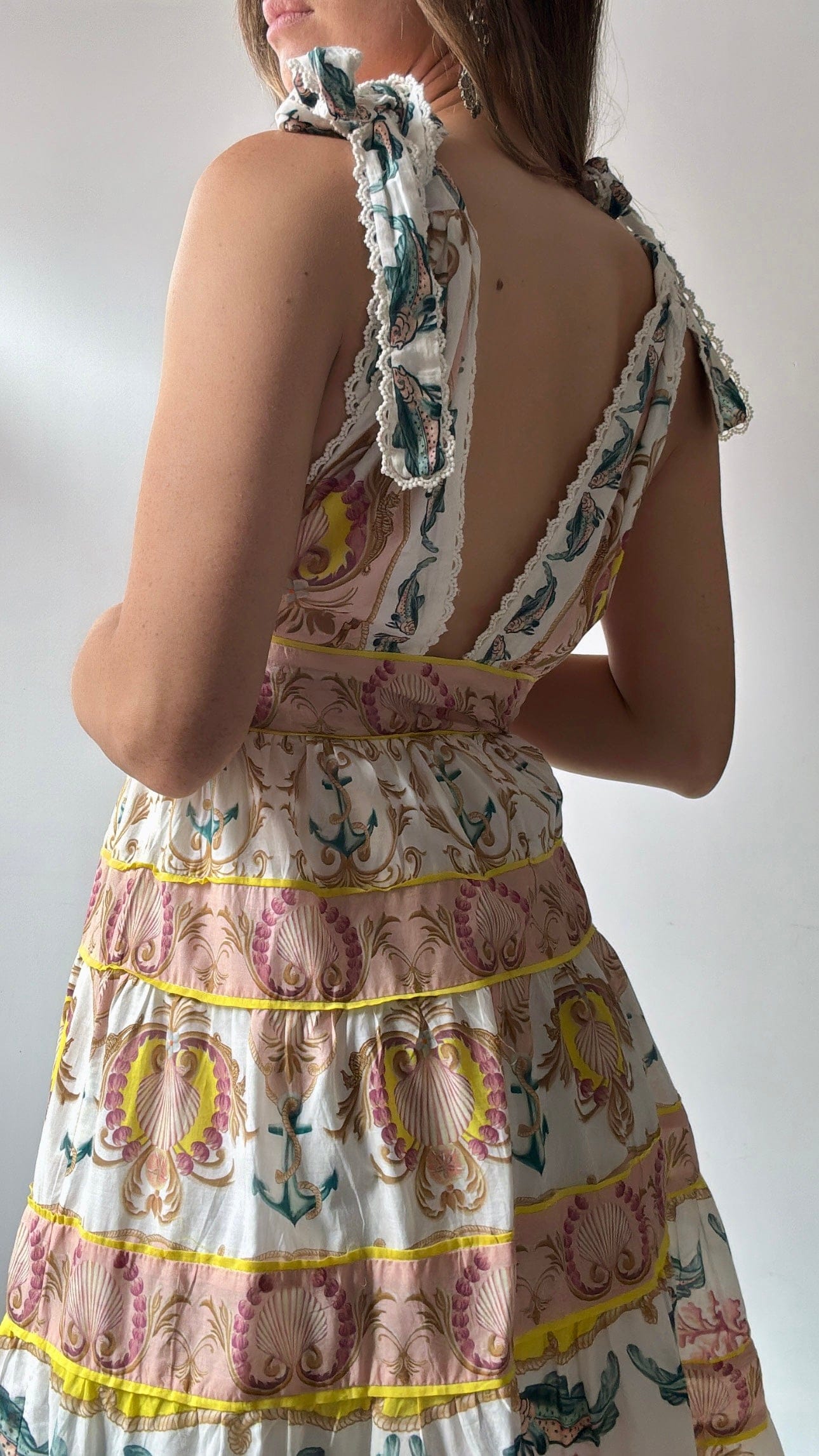 Brazilian designer Farm Rio’s joyful festive vibe on display in this 100% light cotton long midi sundress with tie up straps.tiered full skirt, side zip and fully lined. Only one in this colour way. Ellie is size 1.74cm NZ8/10.
