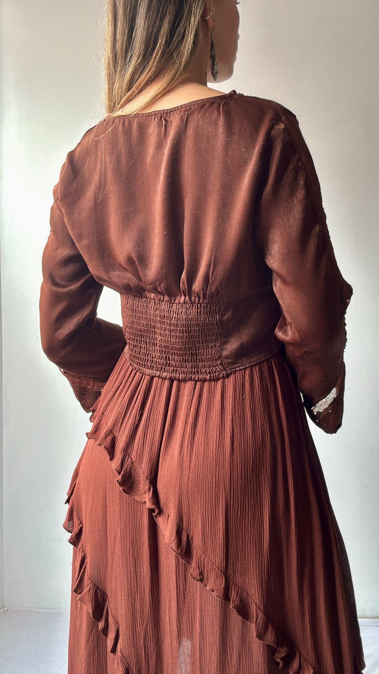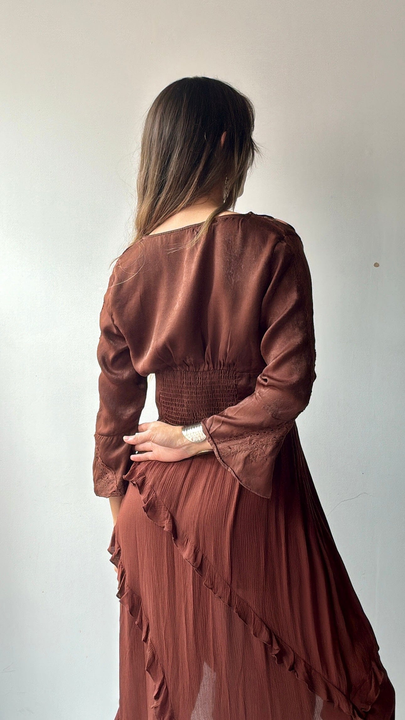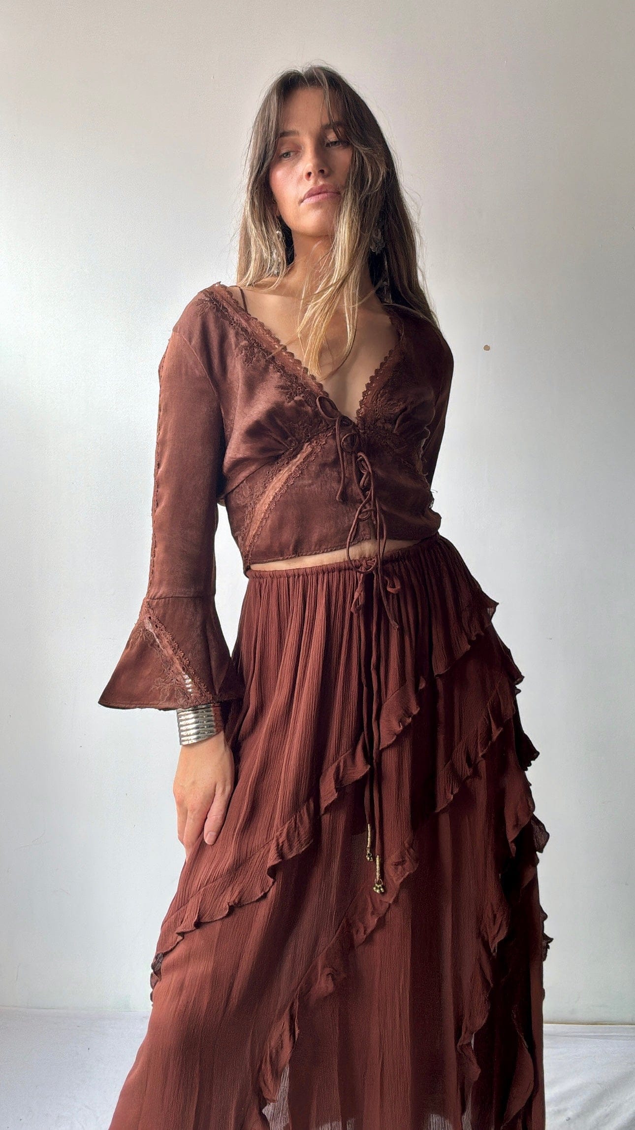 So soft and flattering with gorgeous lace detail  multiple ties and shirting back and frill sleeves. Elly is 1.75cm tall and a size NZ 8/10 and wearing the xs