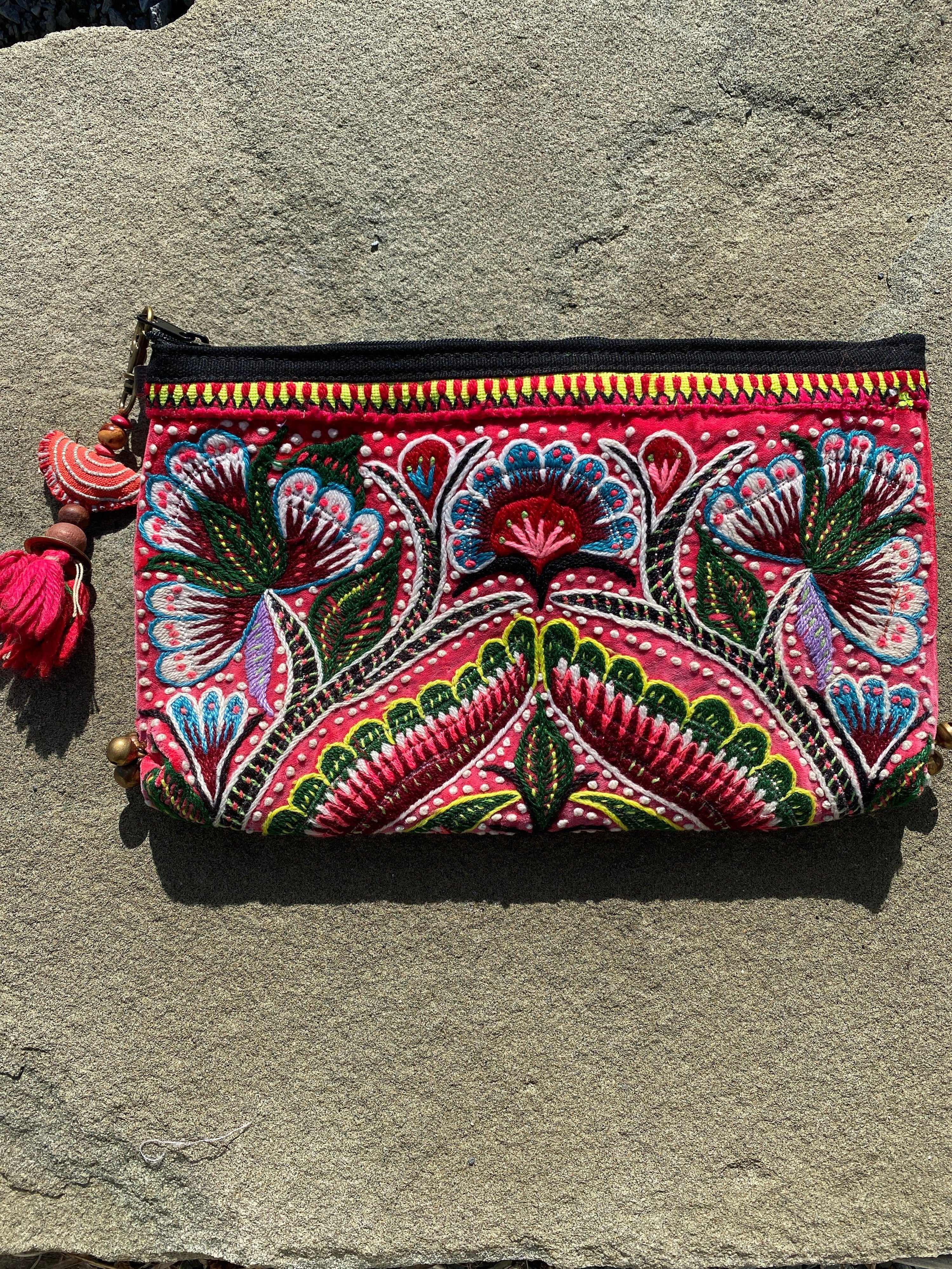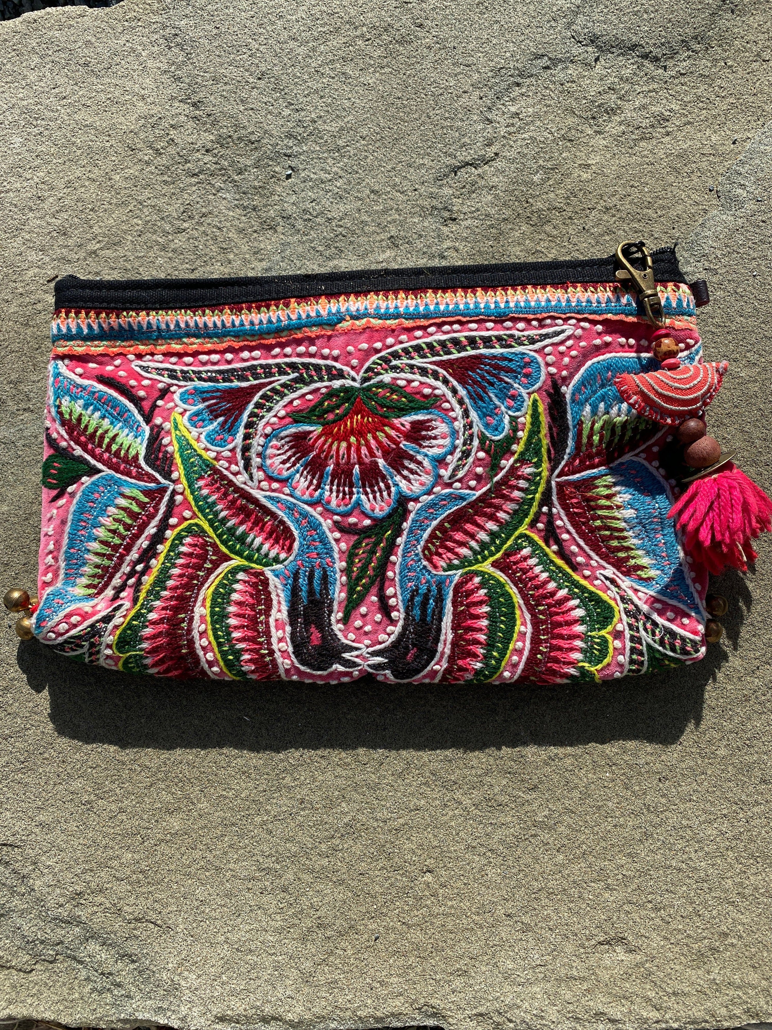 Handmade Tribal Hmong clutches, using traditional embroidery techniques of the minority Miao people, these beautiful clutches symbolize their unique cultural art form. Each is lined in aubergine and is adorned with handmade tassel and little brass bells. 28cm x 17cm