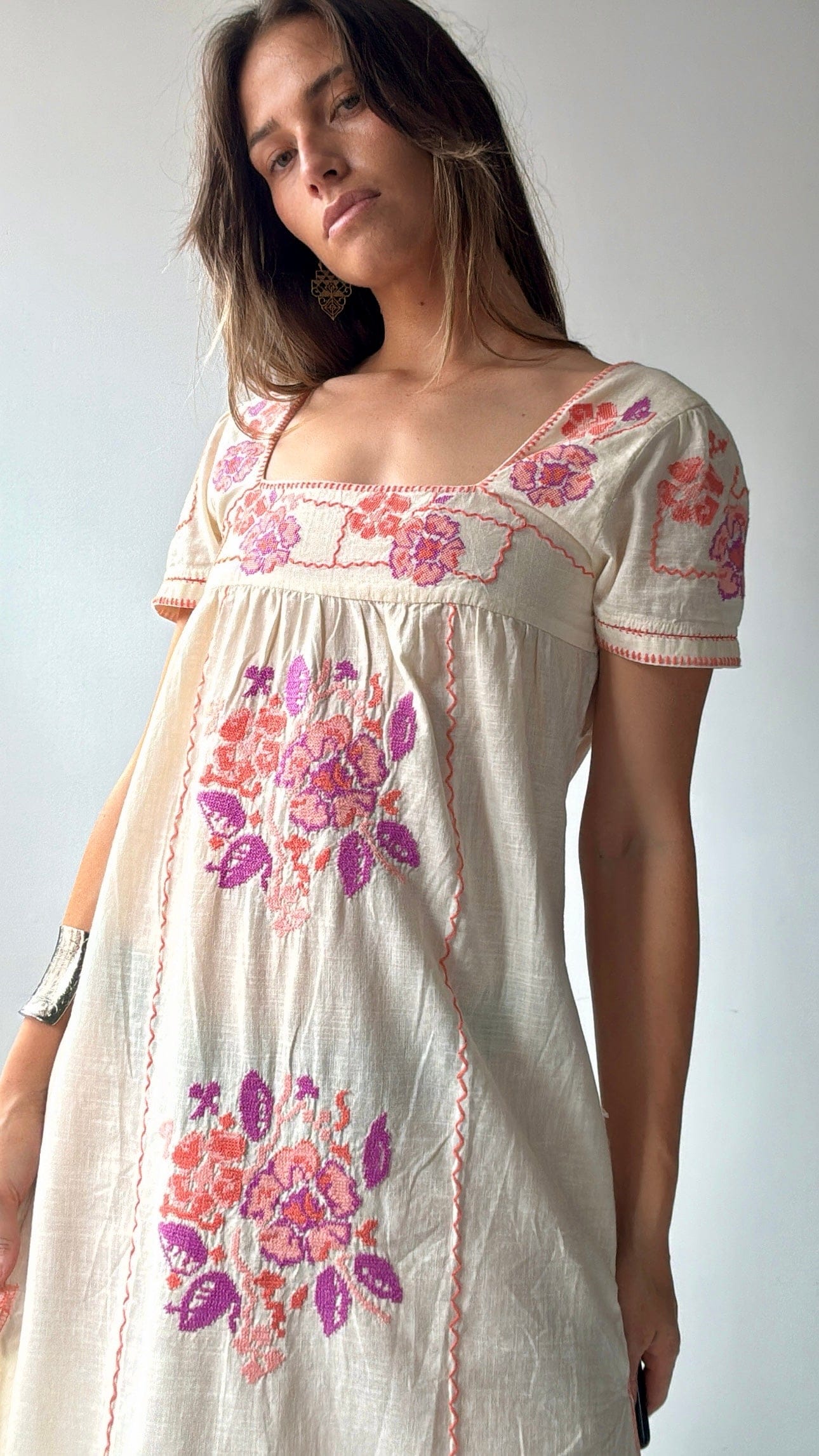 Dreamy feminine cotton fabric in cream with pretty cross stitch embroidered detail in apricot, pink and lavender. Midi length smock style.  Model Elly is 1.74cm a NZ 8/10 wearing the XS (8)