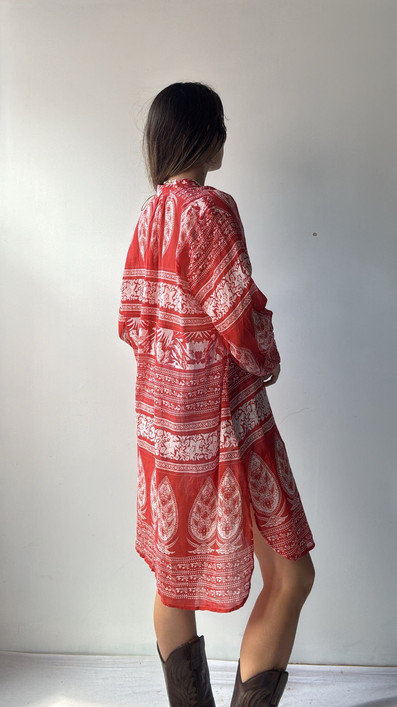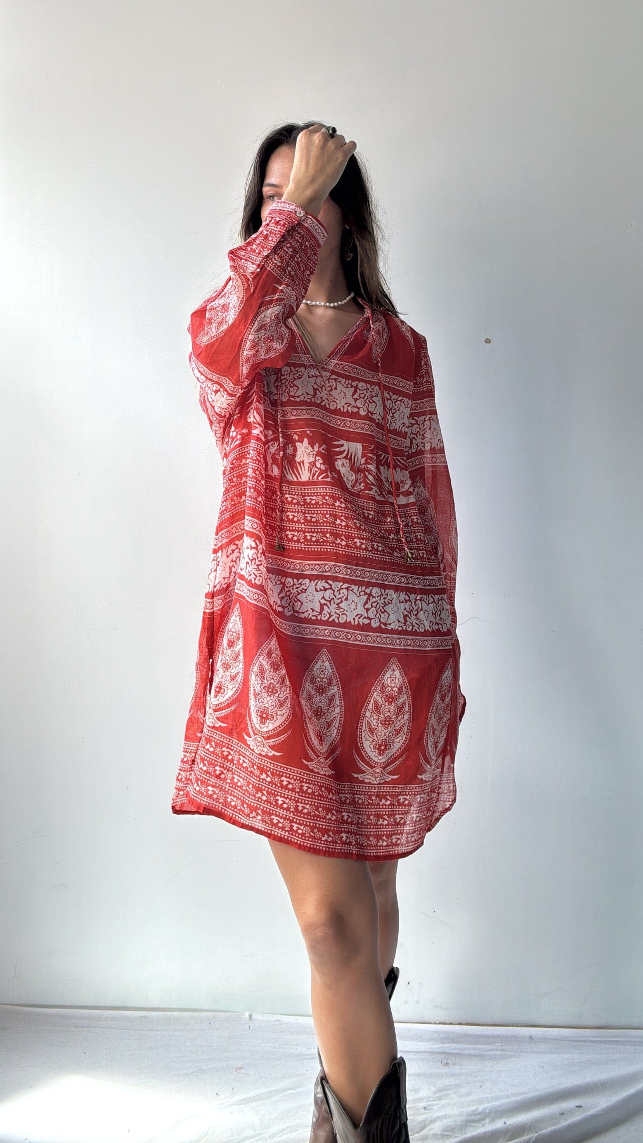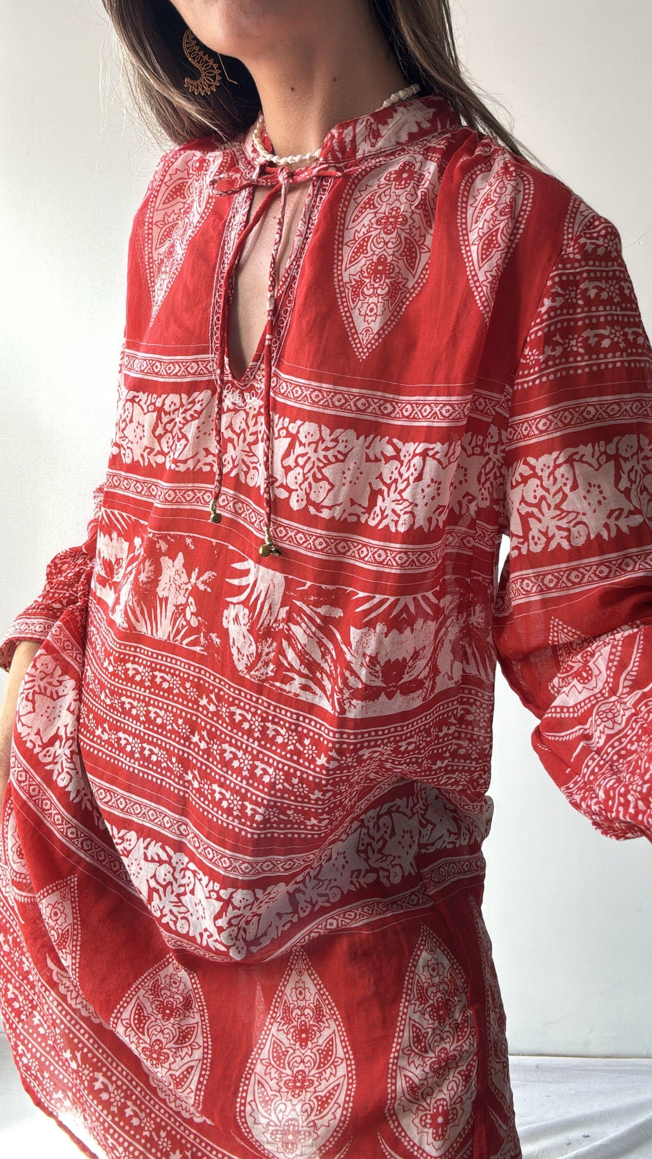 Star Mela  lightweight cotton block print  blouse/dress with pretty tie up open front. Perfect summery vibe and easy to wear. Model Elly is a size8/10.