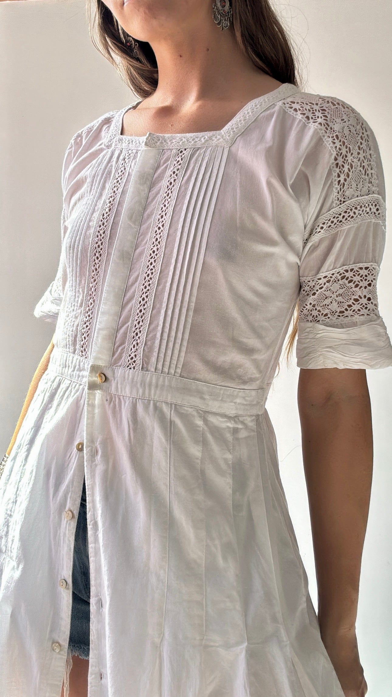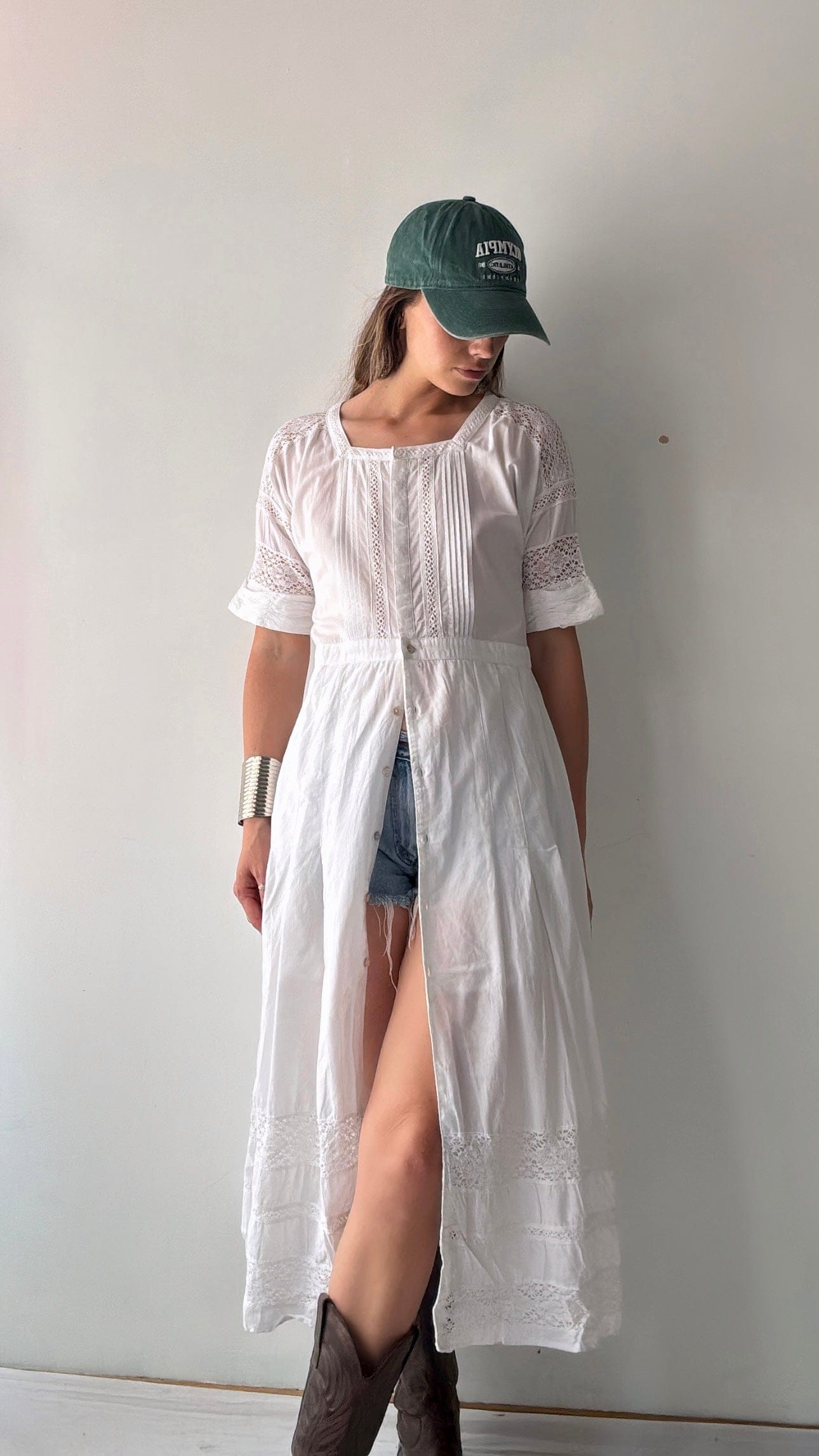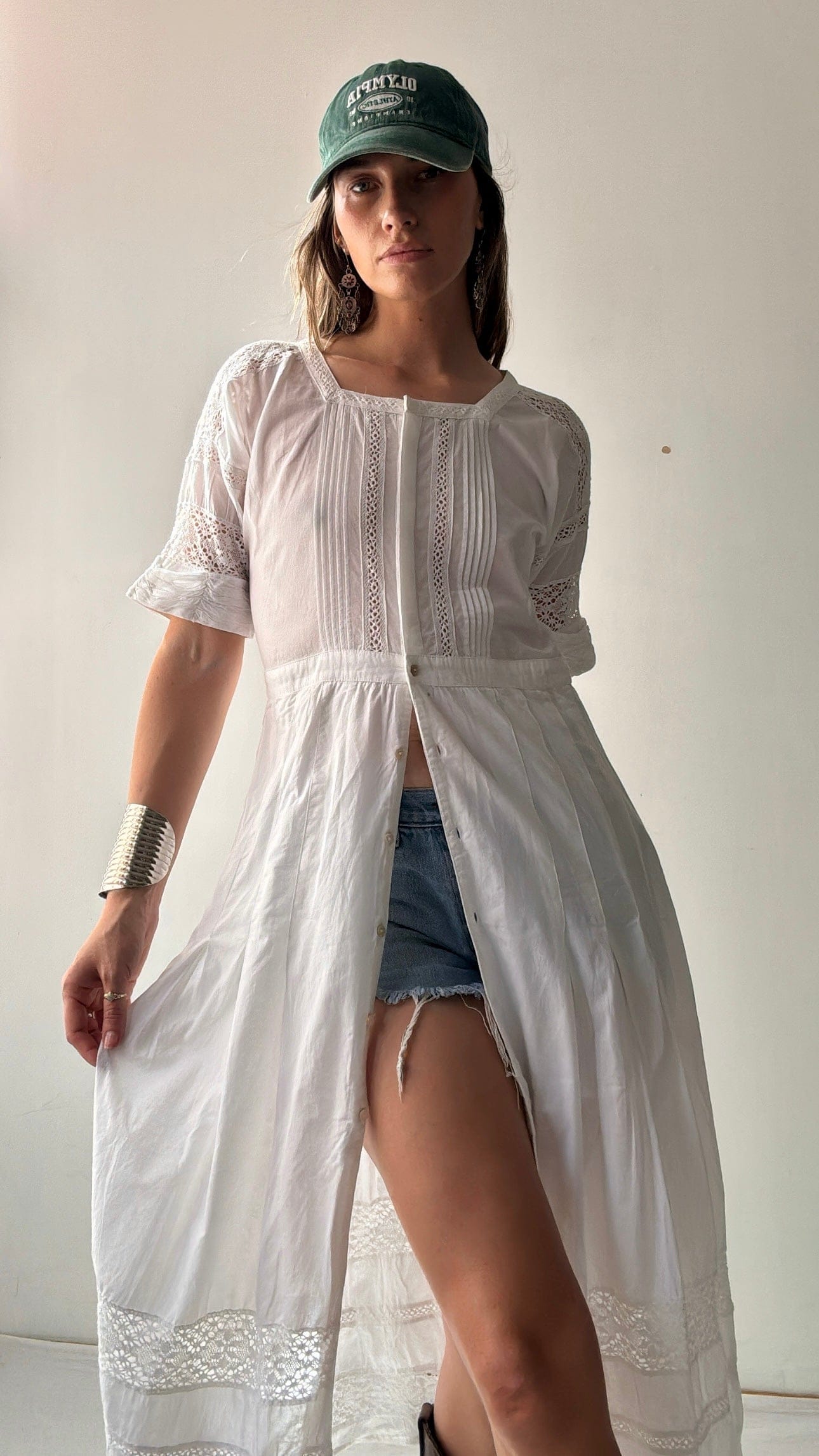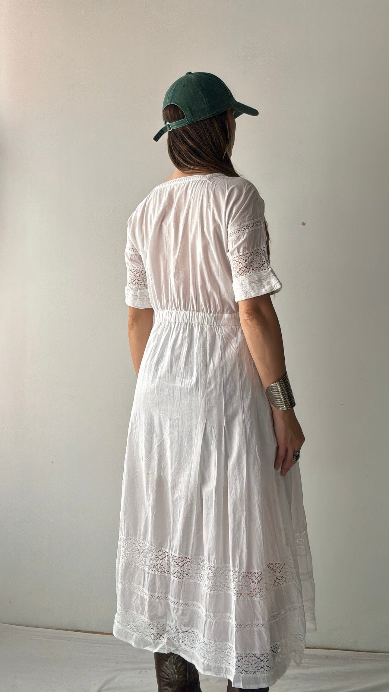 Divine pure cotton maxi dress, with intricate cotton lace detailing and button down front. Double lined from waist to thigh. Model Elly is 1.74cm tall and NZ 8/10.