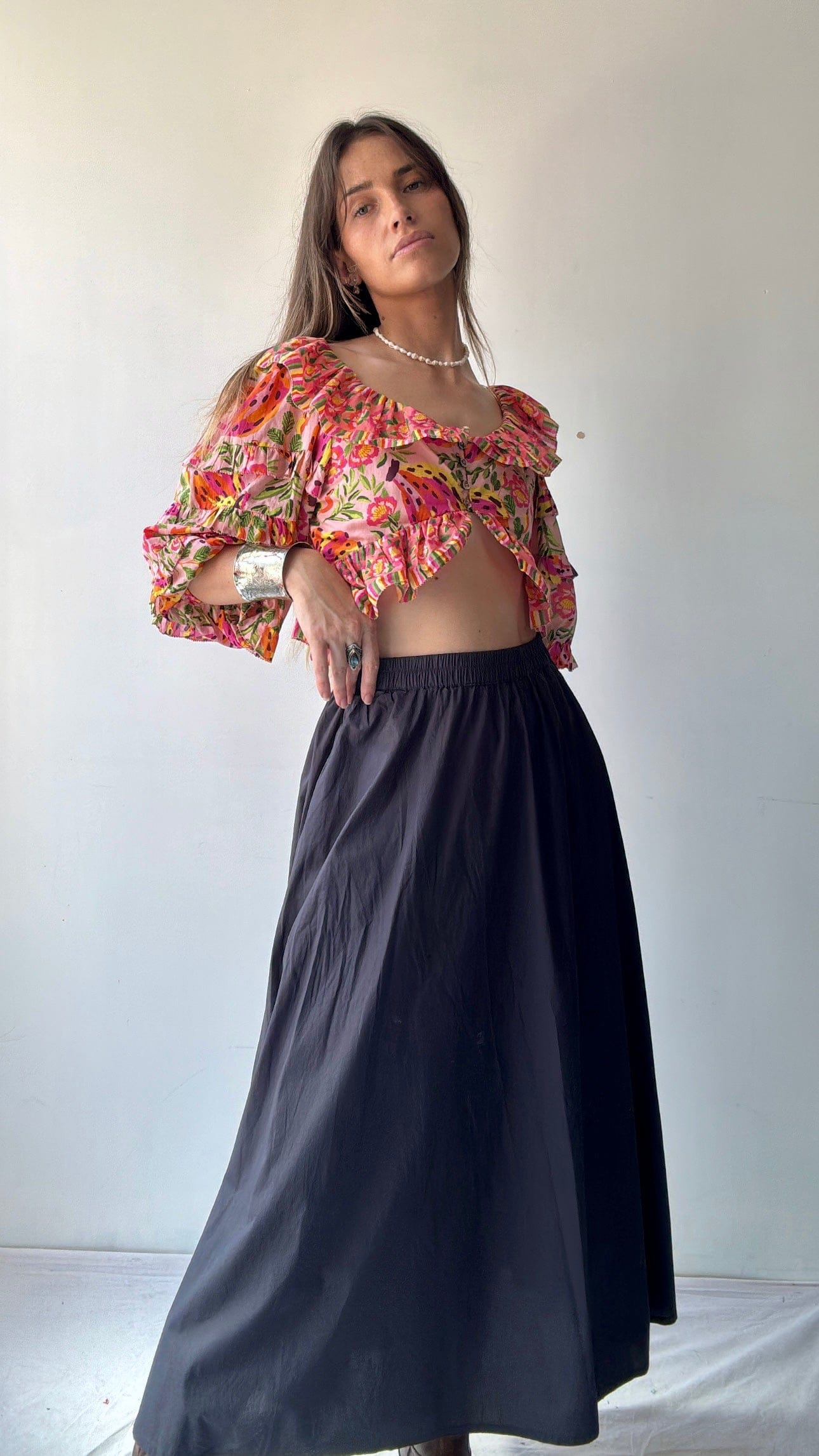 100% cotton full skirt in long midi length with elastic waist band and pockets. Dress up or down. Available in 5 colours. Adorable with cowboy boots. Our model Elly is 1.74cm. She’s a size NZ 8-10. And wearing the medium