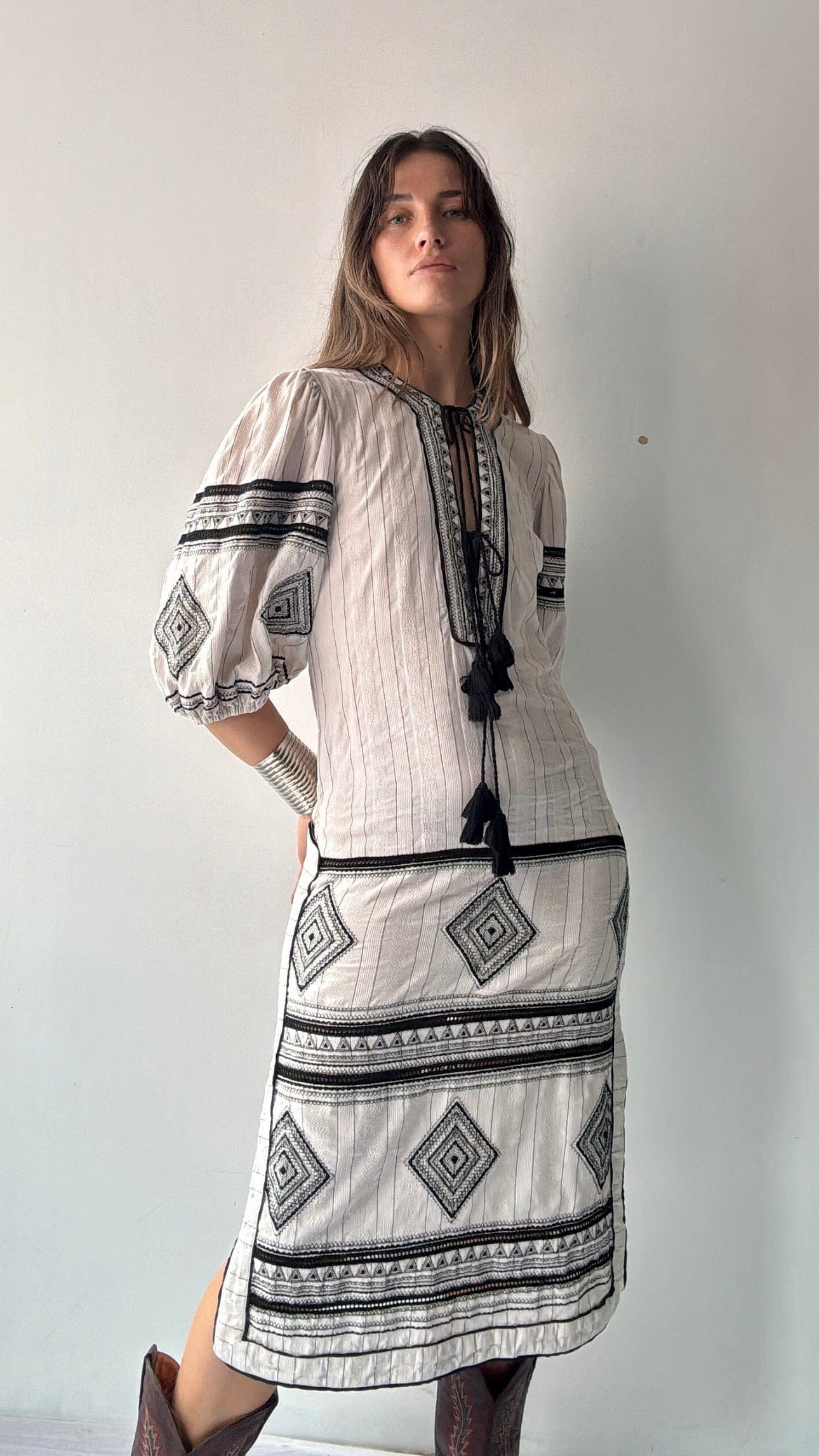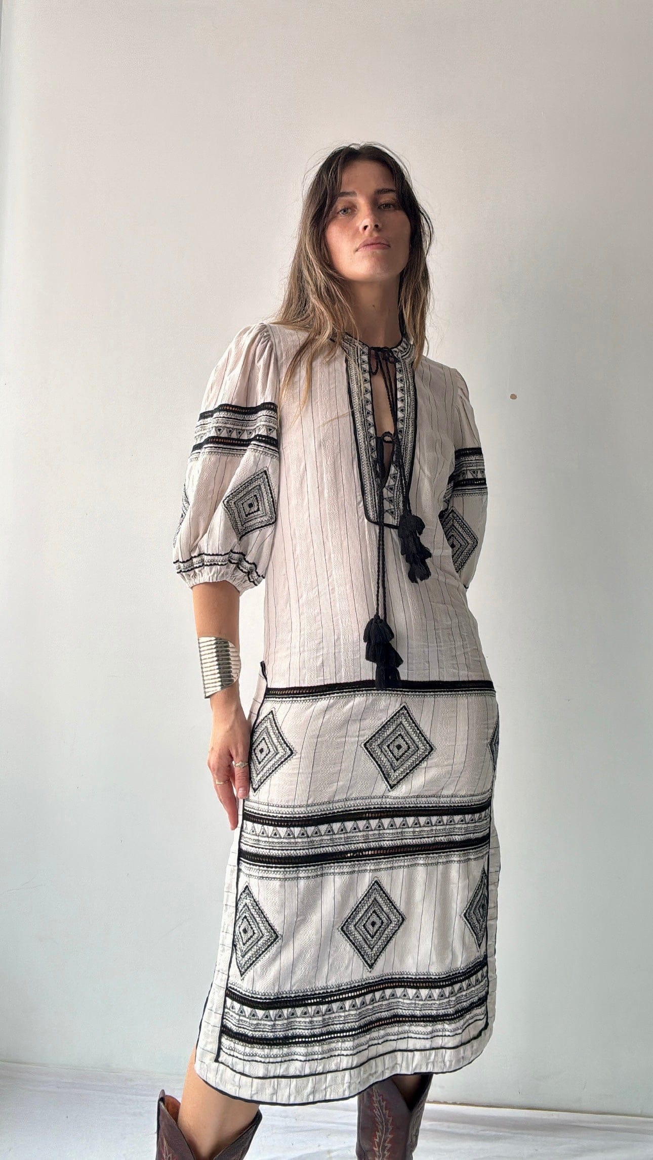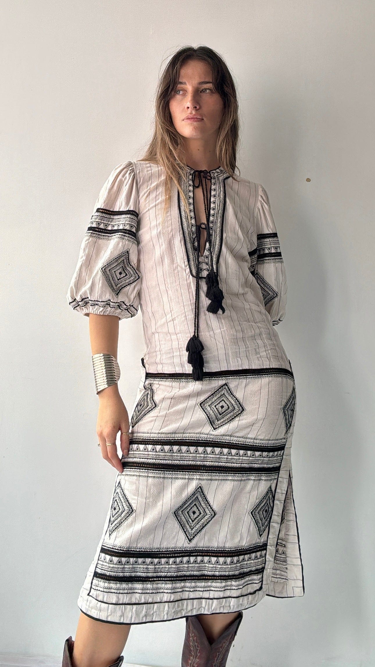 Incredible one-off piece from high end label Scarlett Poppies. Made from 100% natural cotton, this gorgeous midi dress with side splits has been made with love and features stunning traditional hand embroidery. Model Elly is 1.74cm and NZ 8/10. Wearing the small. Slim hips good for this one