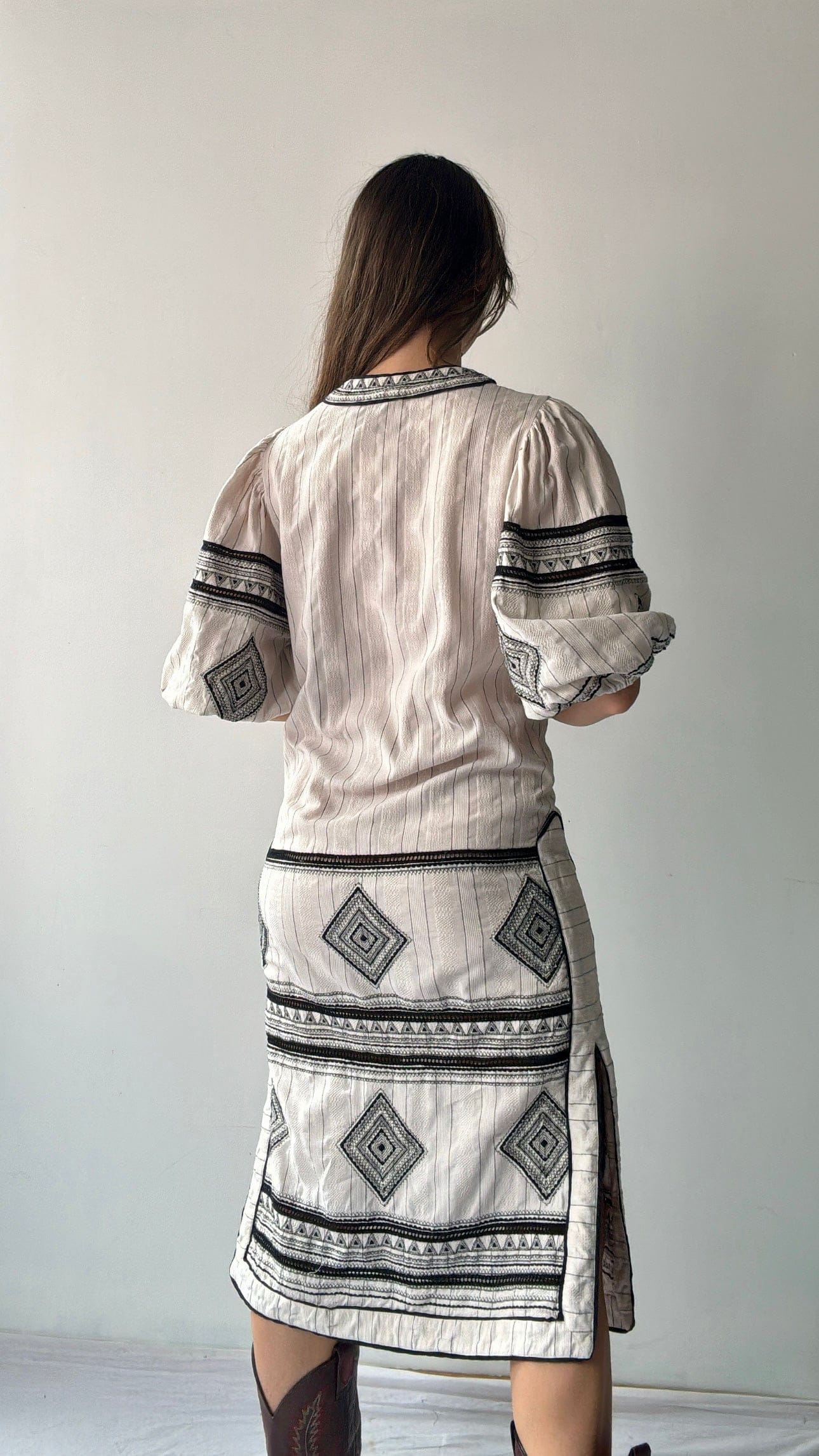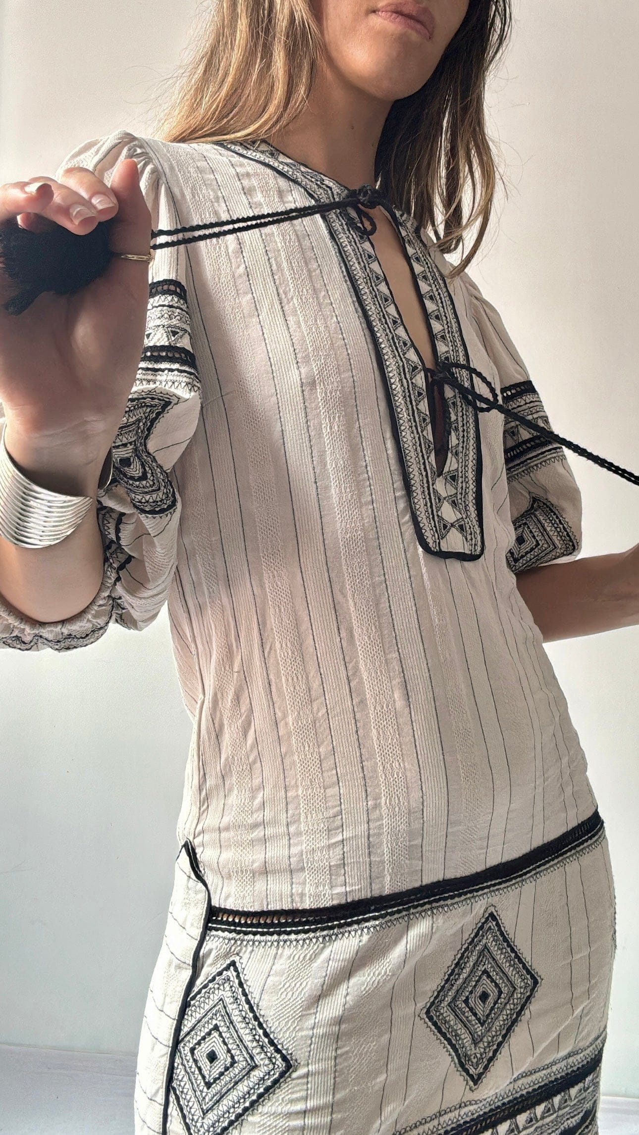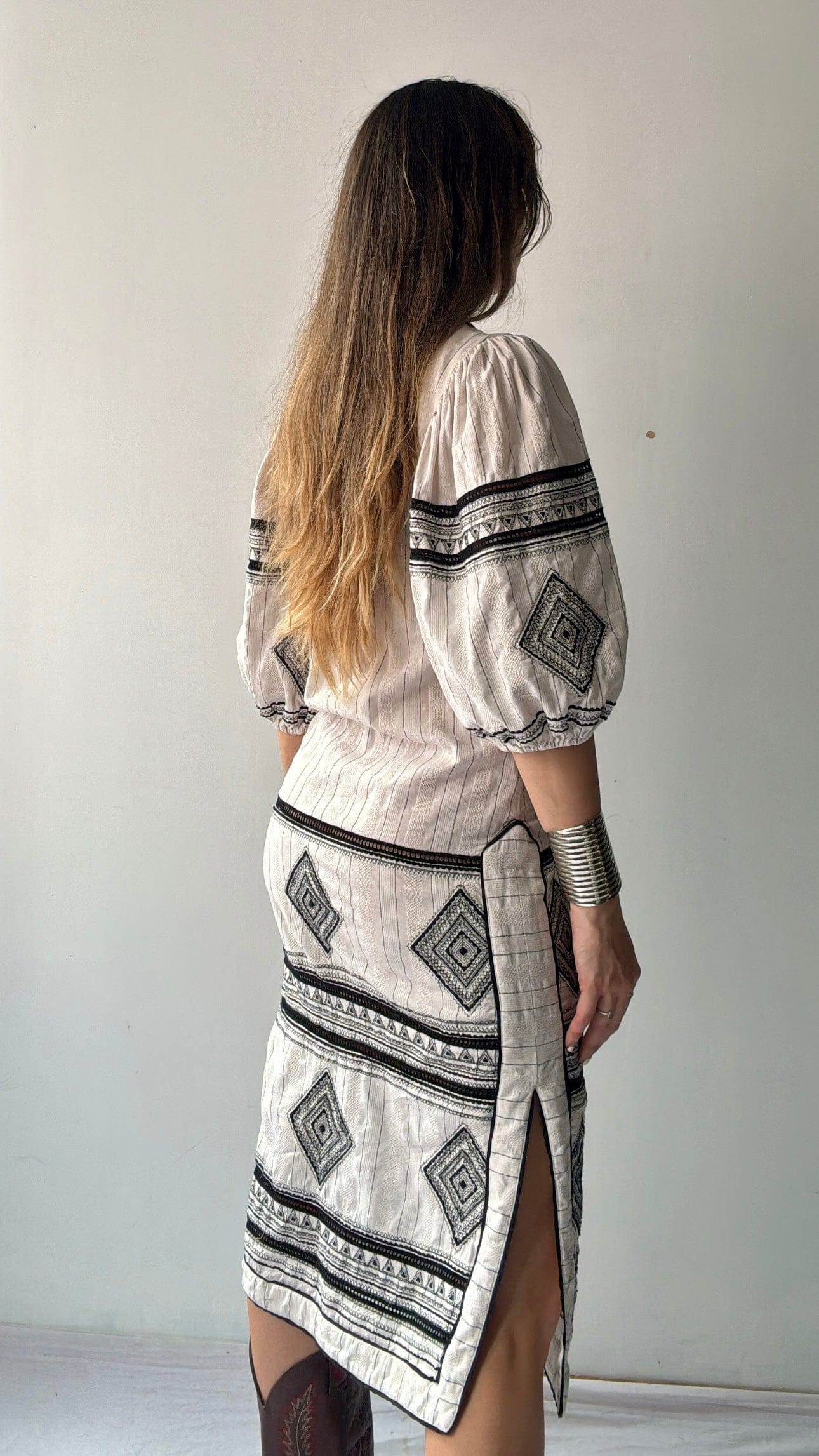 Incredible one-off piece from high end label Scarlett Poppies. Made from 100% natural cotton, this gorgeous midi dress with side splits has been made with love and features stunning traditional hand embroidery. Model Elly is 1.74cm and NZ 8/10. Wearing the small. Slim hips good for this one