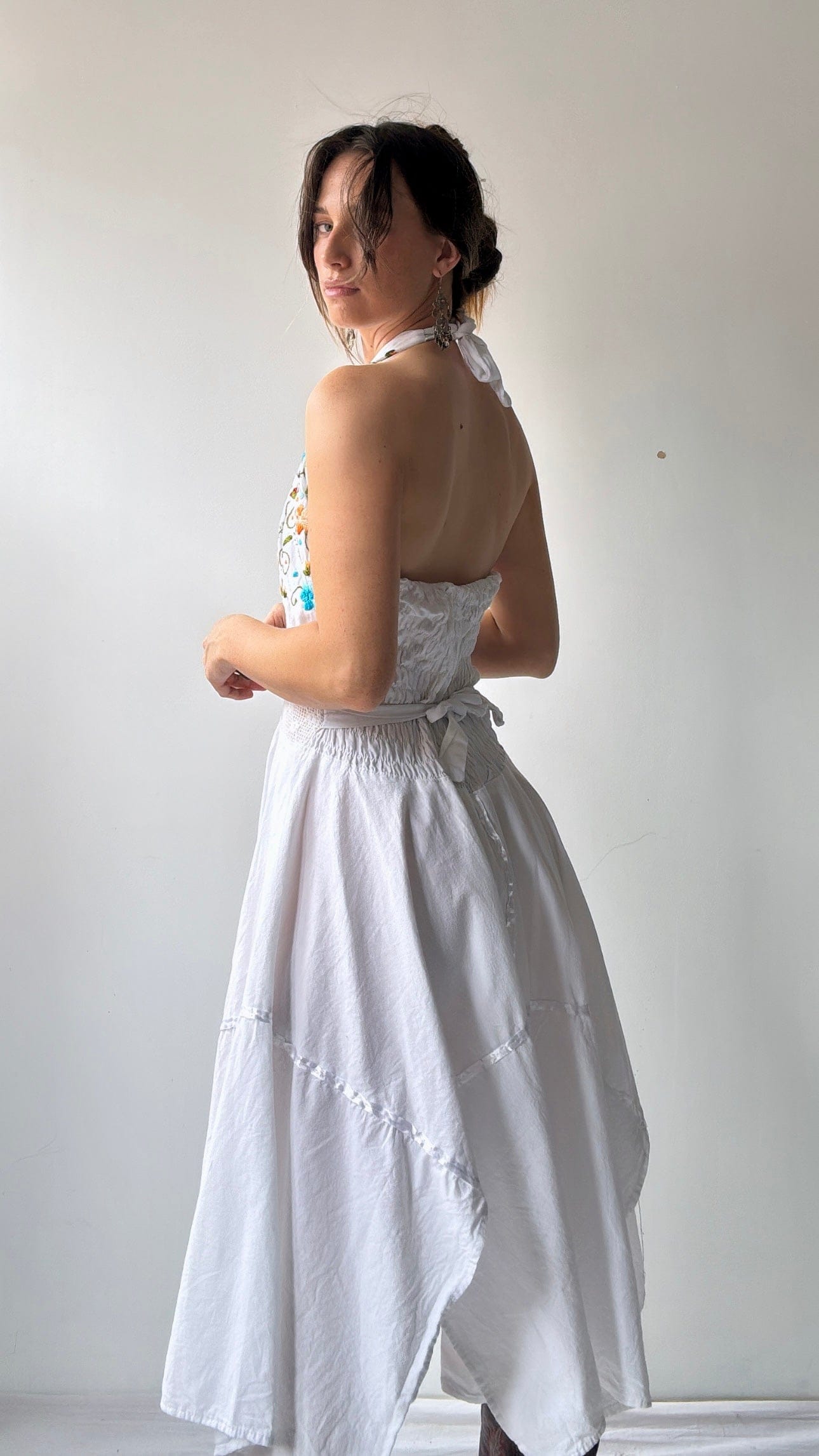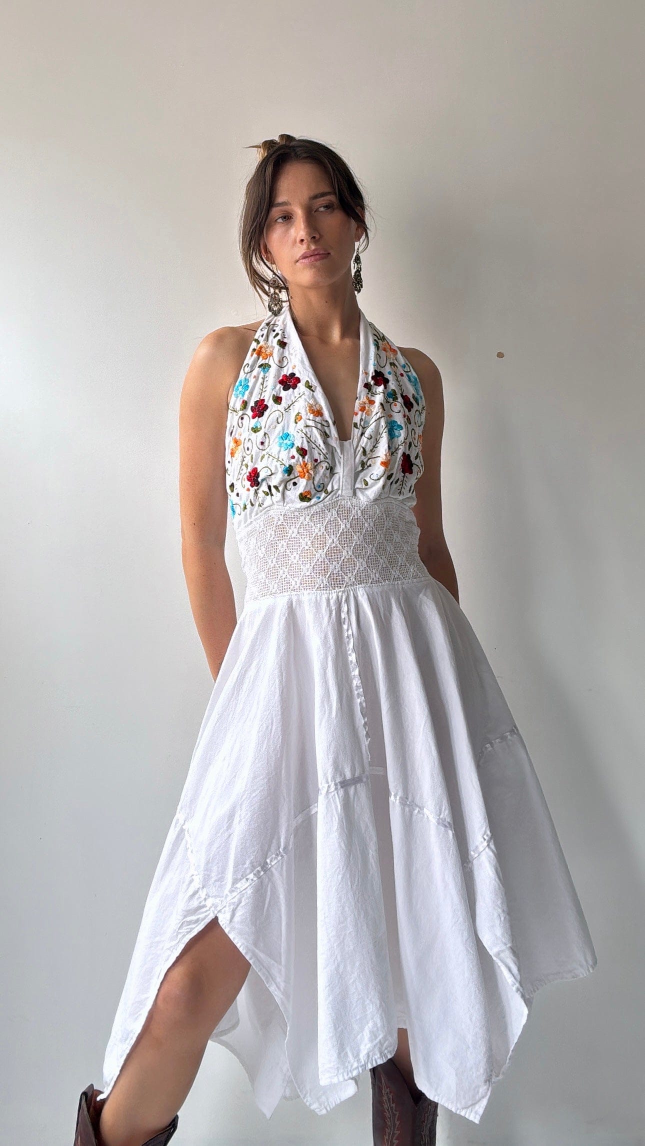 Gorgeous 1970’s authentic Mexican vintage dress with hand embroidered flowers and shirring waist , a rare, dreamy summer pleasure. Model Elly is 1.74cm. And this is a large