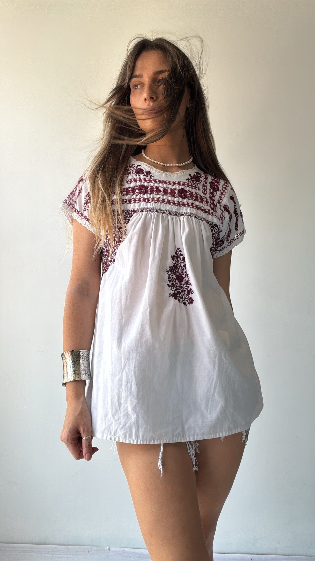 1970’s Mexican, hand embroidered vintage top with capped sleeves. So cute with demon cut-offs. A rare, one off. Model Elly is 1.74cm.